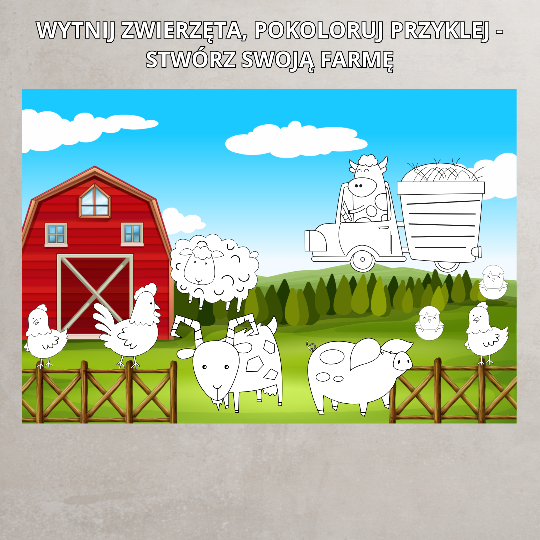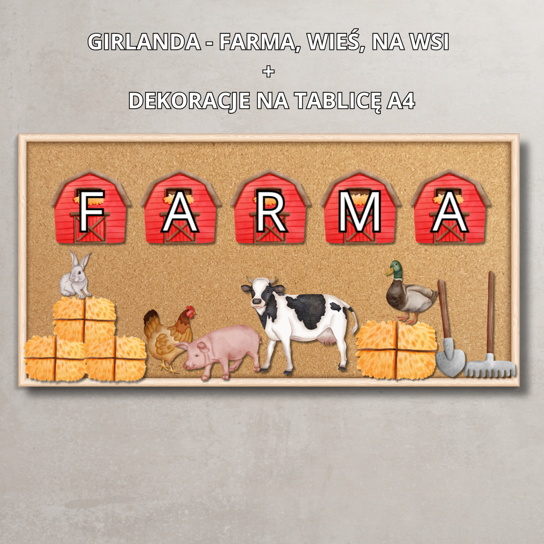 • Plakaty i napisy: „Na wsi”, „Farma”, elementy dekoracyjne (zwierzęta, stodoła, siano, traktor),