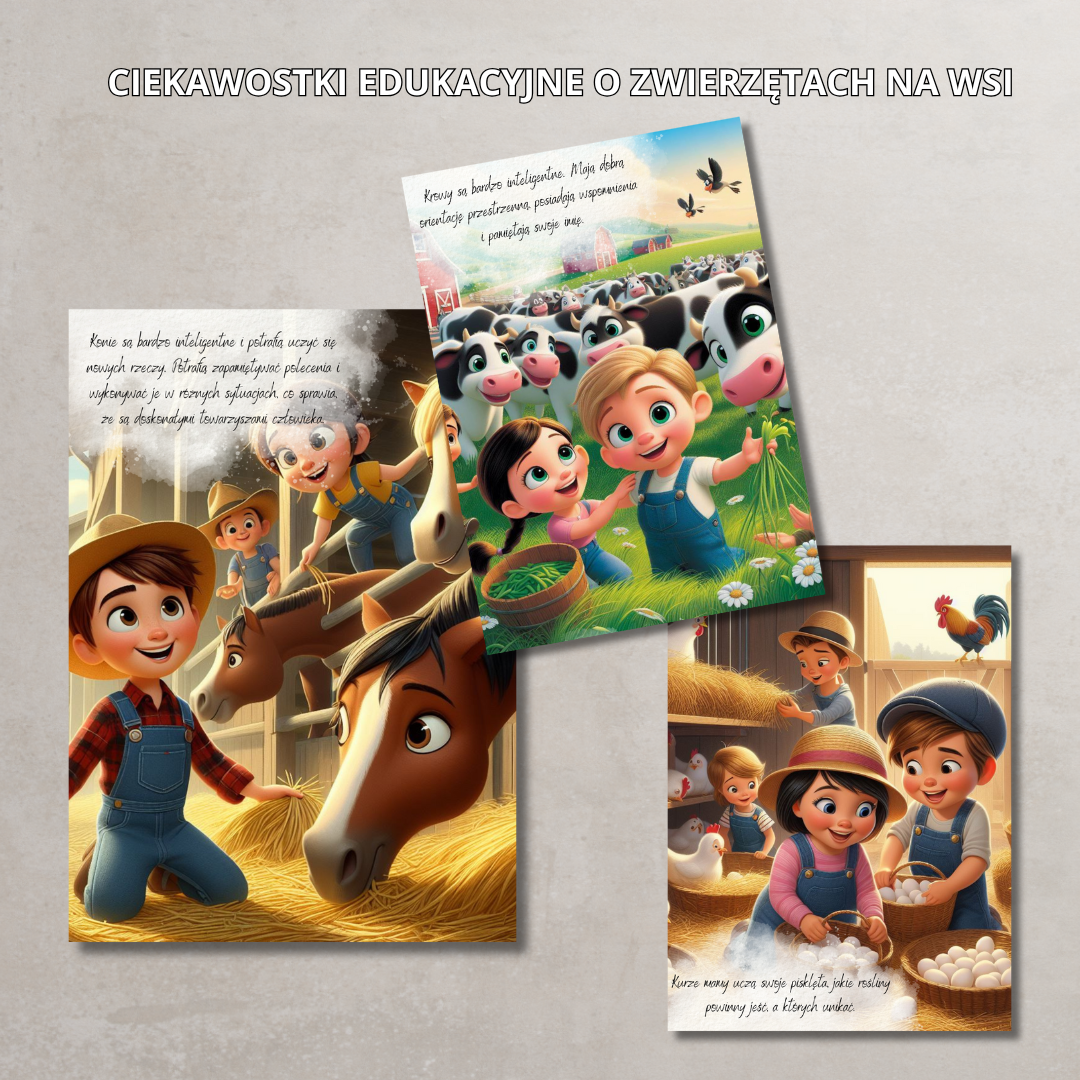 • Pięknie ilustrowane karty edukacyjne z interesującymi informacjami o zwierzętach gospodarskich – doskonałe do rozmów i zajęć tematycznych.