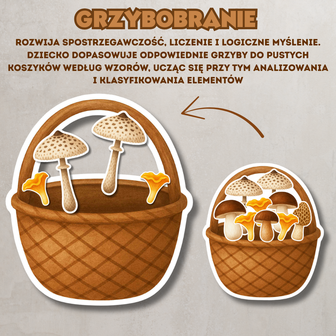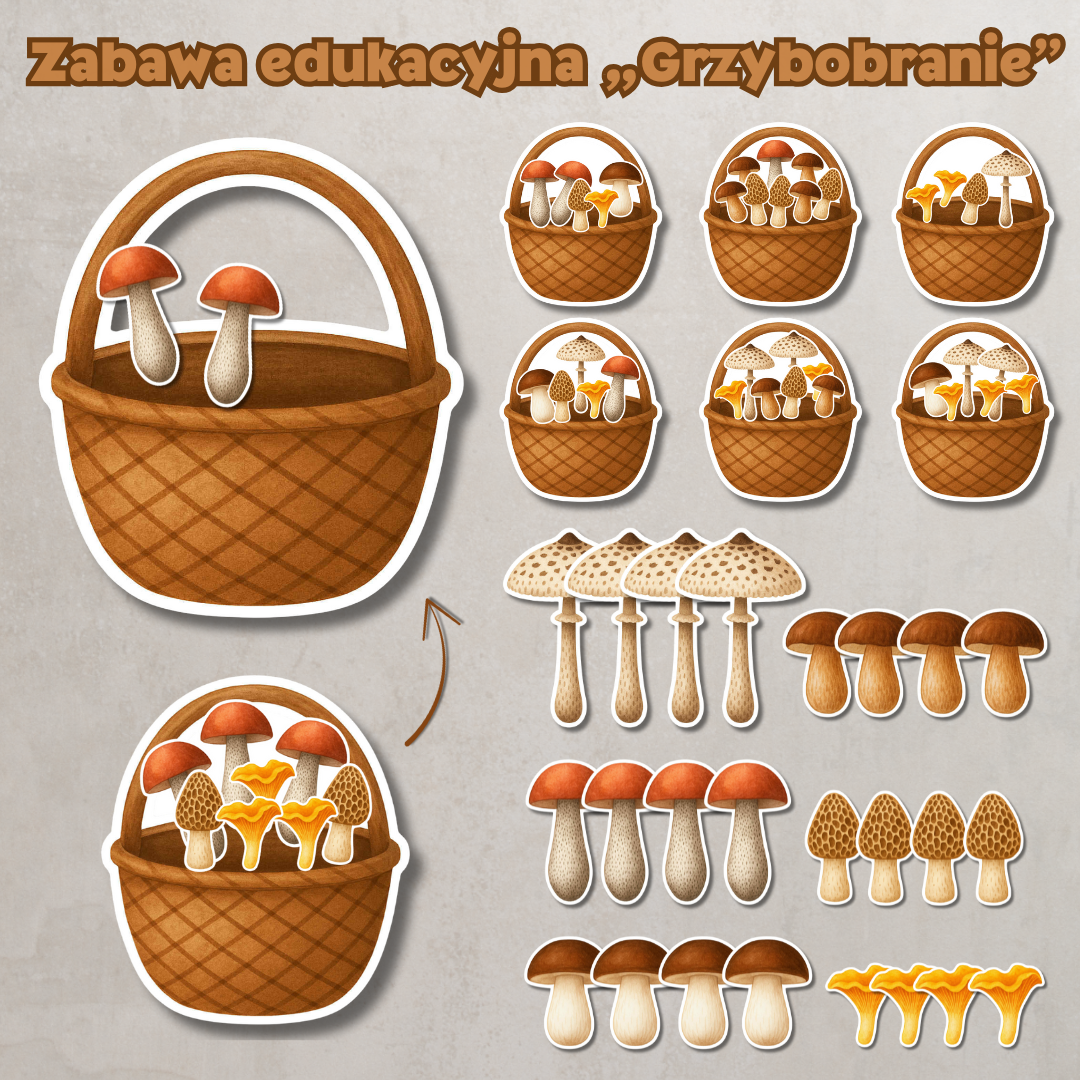 • 4 puste koszyki do uzupełnienia – do samodzielnego dopasowania grzybów przez dziecko,