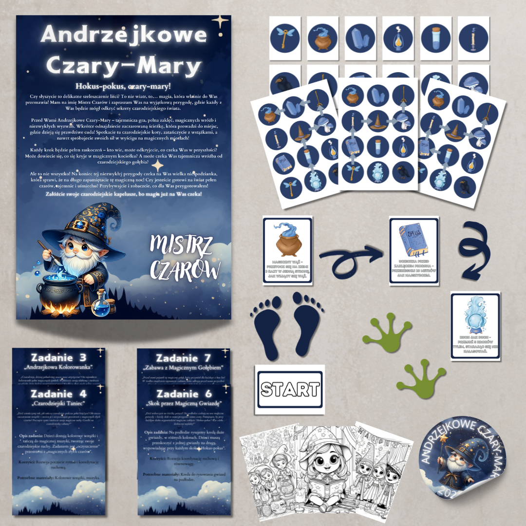 Czarodziejska przygoda, która przenosi dzieci w świat wróżb, zaklęć i dobrej zabawy. Na uczestników czeka Mistrz Czarów, który wita wszystkich słowami pełnymi magii i zaprasza do udziału w niezwykłej wyprawie. W grze znajduje się 10 zadań przygotowanych w klimacie andrzejkowych czarów. Każde z nich rozwija spostrzegawczość, współpracę i kreatywność, a jednocześnie dostarcza mnóstwo radości.