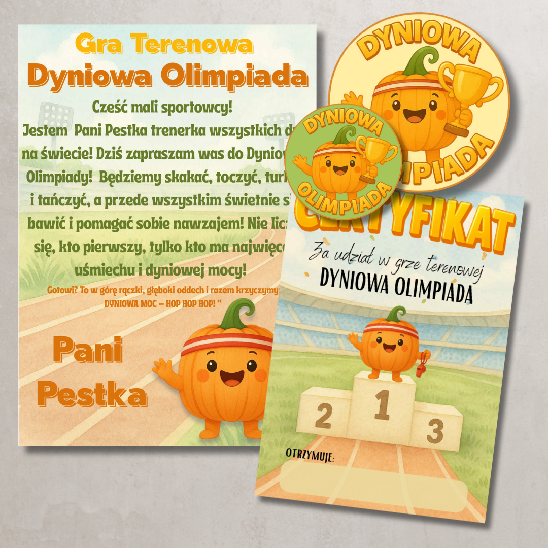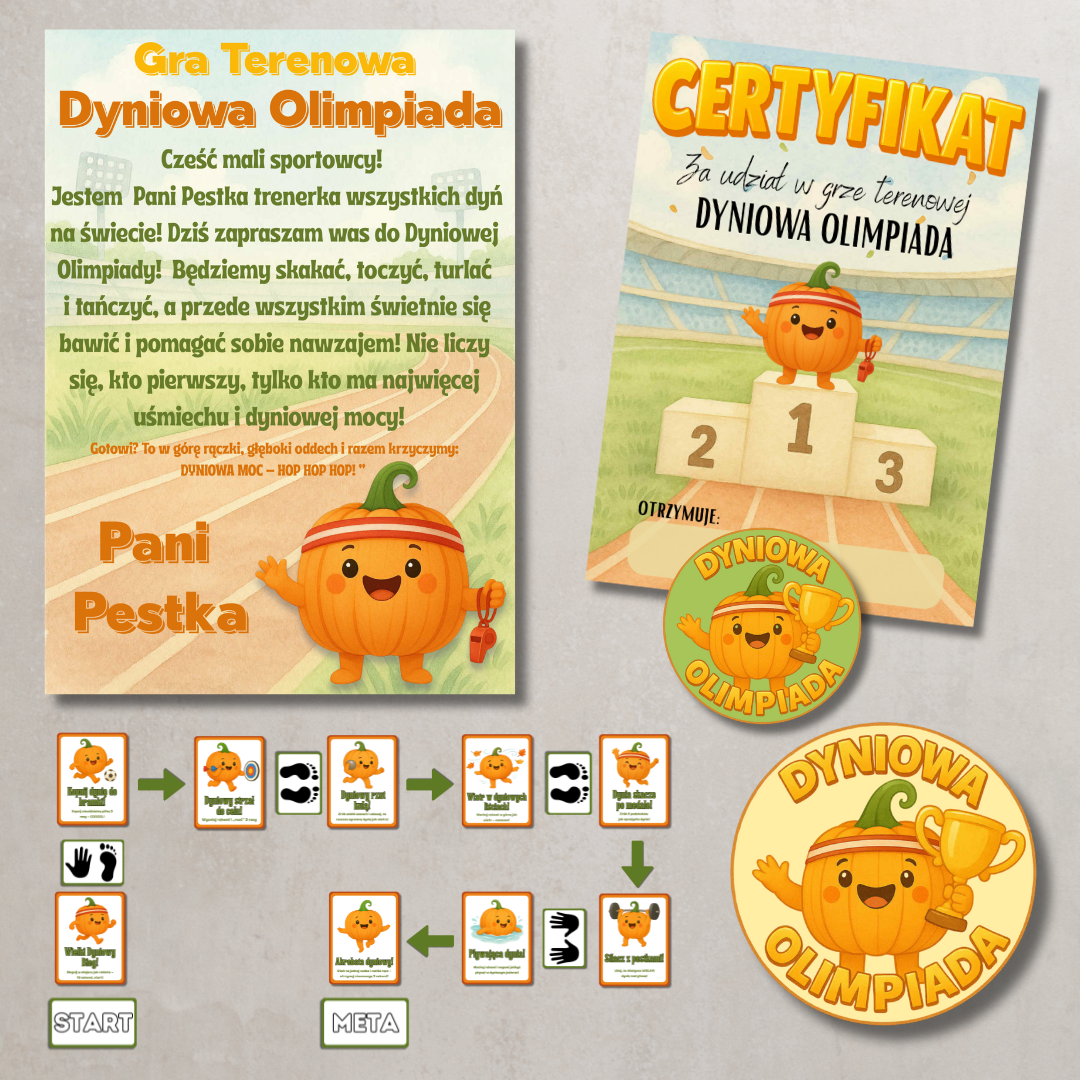 Zapraszamy do wspaniałej zabawy z Panią Pestką – najradośniejszą trenerką wszystkich dyń na świecie! „Dyniowa Olimpiada” to gotowy pakiet do samodzielnego wydruku (PDF), który wprowadzi dzieci w świat ruchu, współpracy i jesiennej radości. Doskonały do zabawy w przedszkolu, szkole, na pikniku, w ogrodzie lub w domu.
