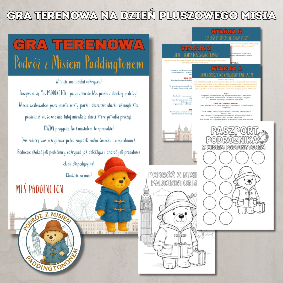 Wyjątkowa gra terenowa „Podróż z Misiem Paddingtonem” to kompletny zestaw materiałów stworzony specjalnie na Dzień Pluszowego Misia. To gotowy scenariusz pełen przygód, ruchu, kreatywności i dziecięcej radości, który przenosi przedszkolaków w świat podróży małego misia.
