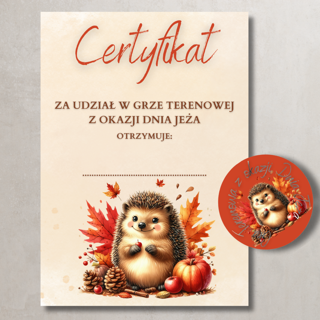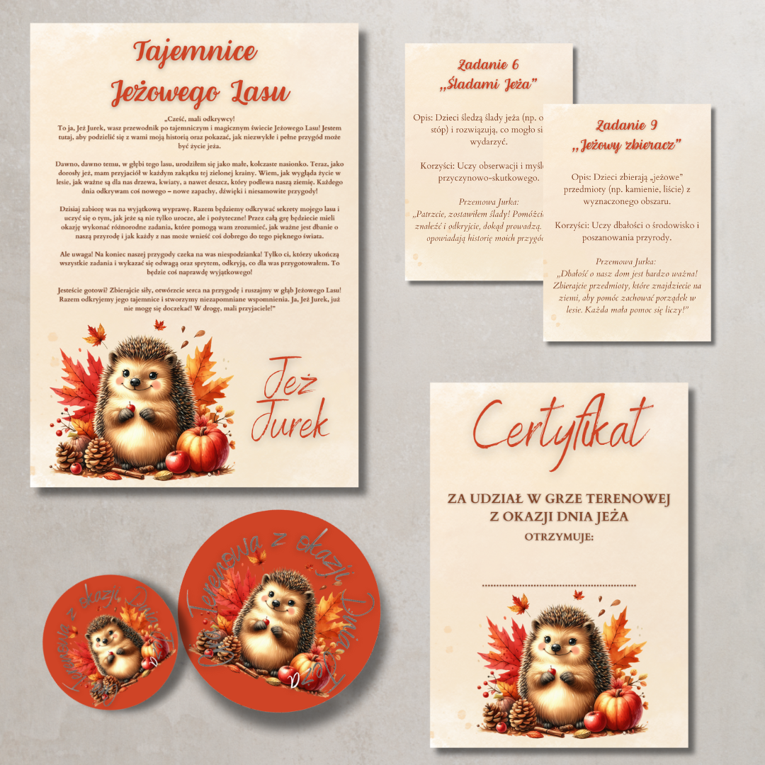 • Certyfikat uczestnictwa – pamiątka dla każdego dziecka biorącego udział w grze. • Odznaki tematyczne z jeżem – do wykorzystania jako nagrody lub element dekoracyjny.