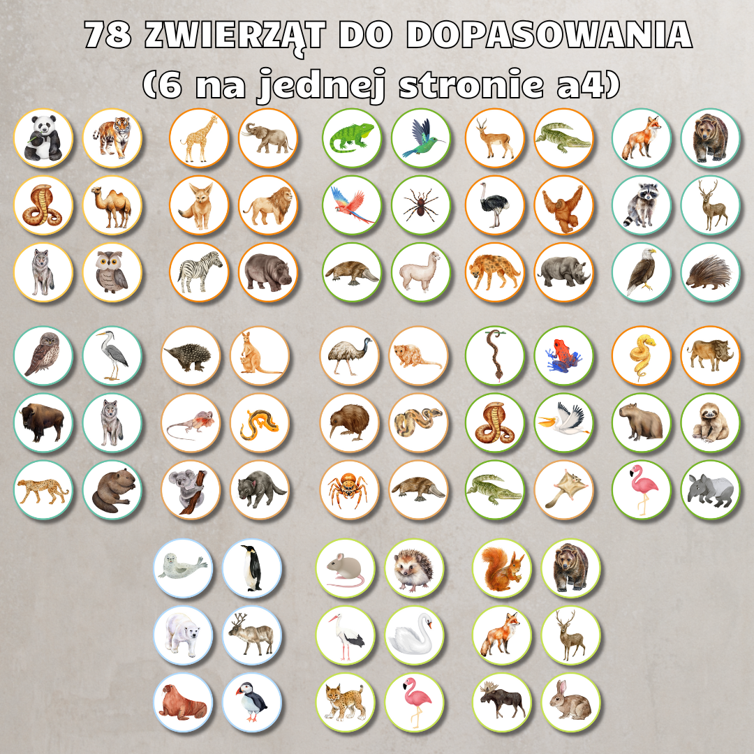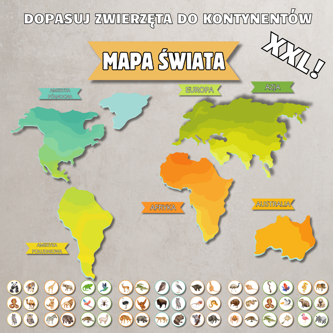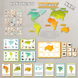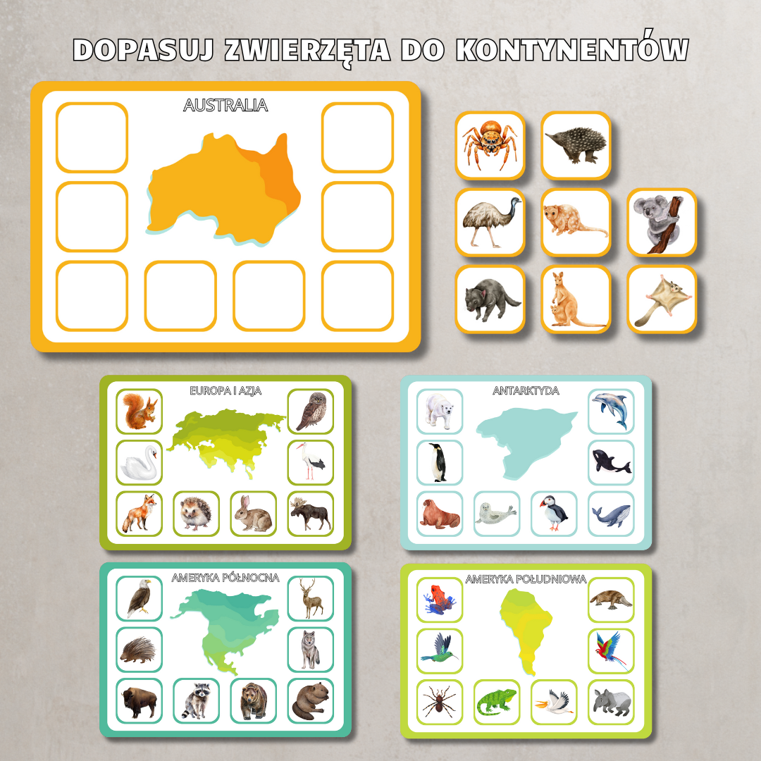 • Zestaw „Dopasuj zwierzęta do kontynentów” – atrakcyjna gra edukacyjna, w której dzieci uczą się, gdzie żyją poszczególne gatunki zwierząt.