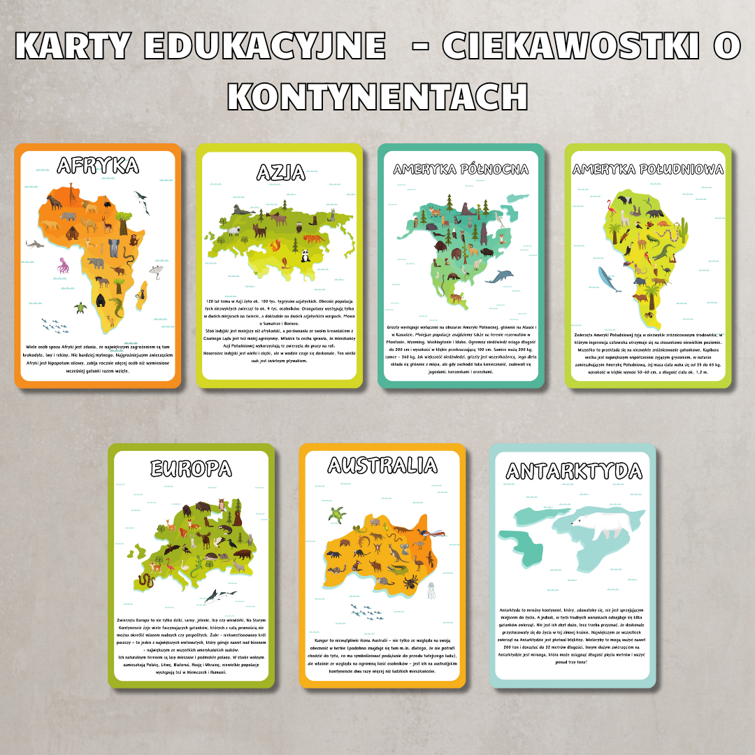 • Karty edukacyjne „Kontynenty” – kolorowe plansze prezentujące wszystkie kontynenty, pomagające w nauce ich nazw i kształtów.