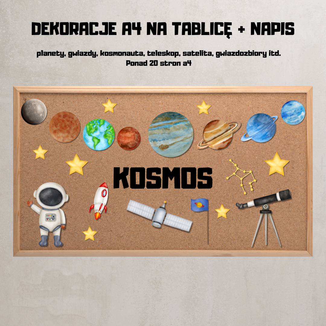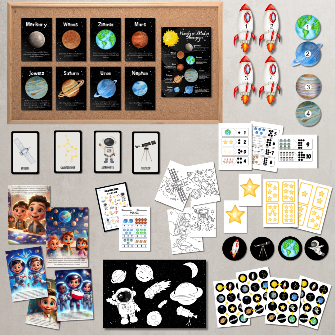 Pakiet „Kosmos” to kompletny materiał dydaktyczny, który przenosi dzieci w fascynujący świat planet i gwiazd, rozwija wyobraźnię, uczy poprzez zabawę i doskonale sprawdza się jako dekoracja tematyczna w sali.