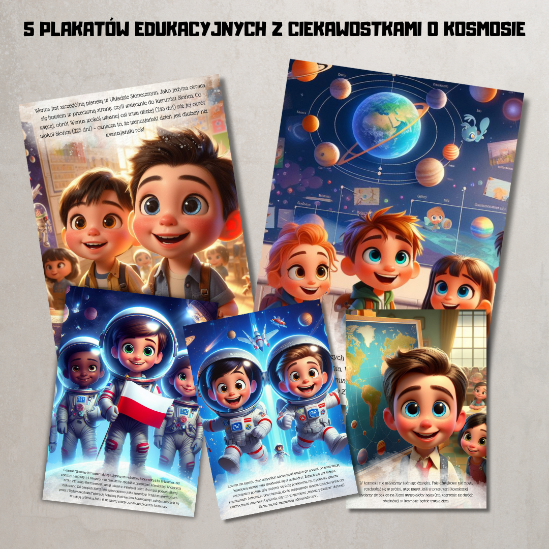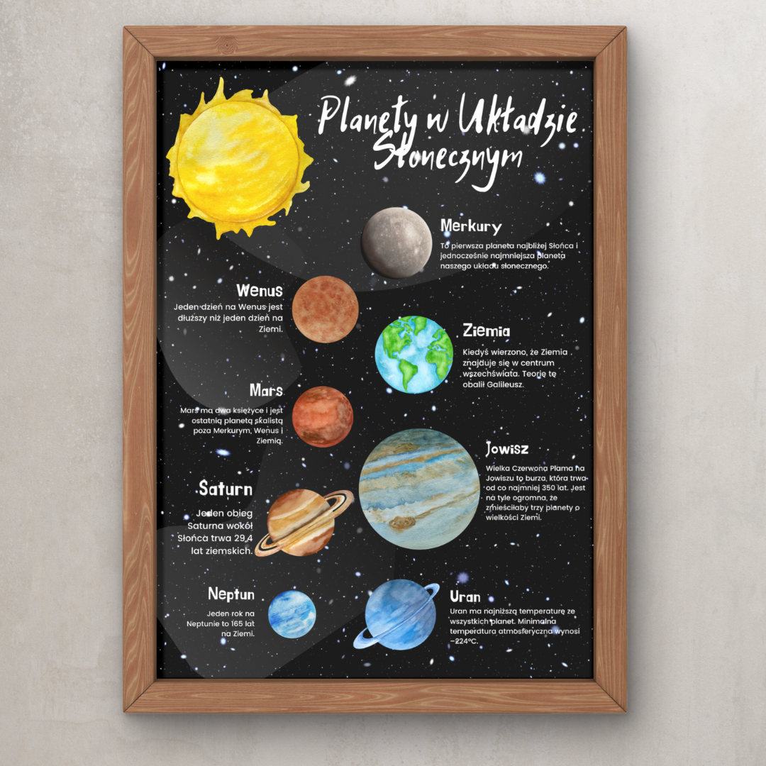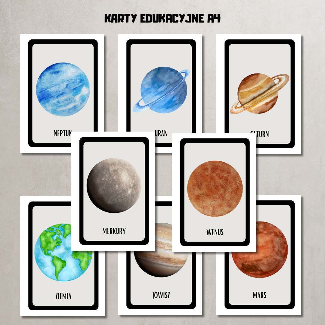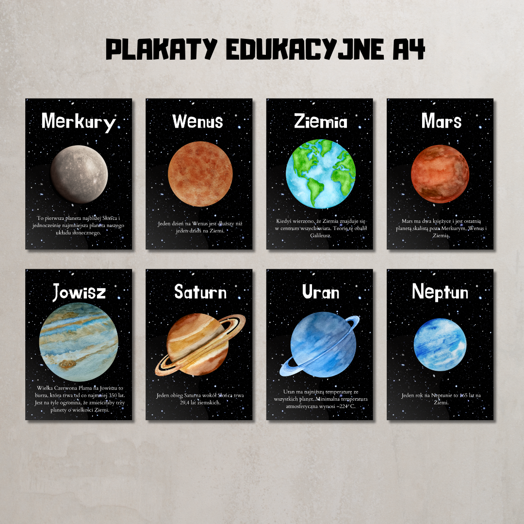 • Plakaty edukacyjne o planetach – kolorowe plansze z opisami Merkurego, Wenus, Ziemi, Marsa, Jowisza, Saturna, Urana i Neptuna; idealne do dekoracji tablicy.