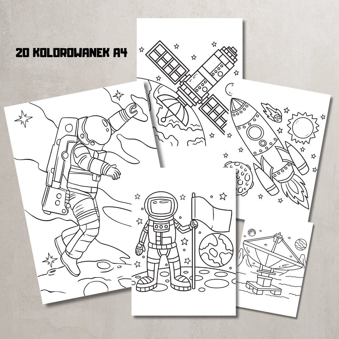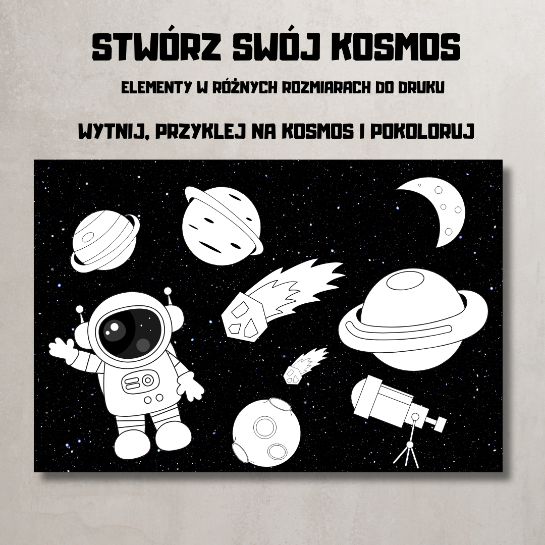 • Kolorowanki i prace plastyczne „Stwórz kosmos” – zestaw do wycinania, kolorowania i przyklejania elementów galaktyki.