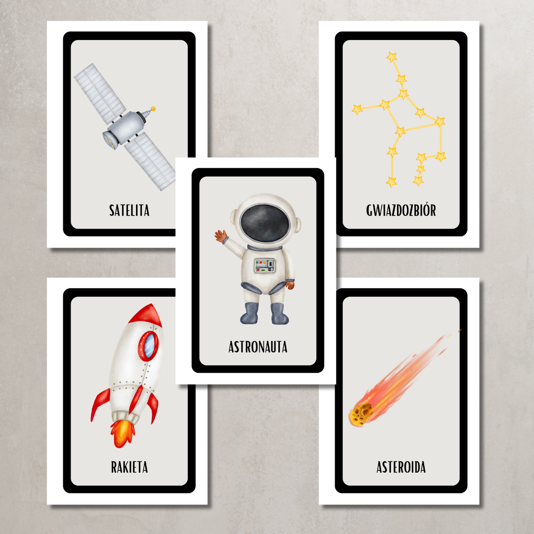 • Karty edukacyjne „Kosmos” – ilustracje przedstawiające elementy przestrzeni kosmicznej: astronautę, teleskop, satelitę, rakietę i wiele innych.