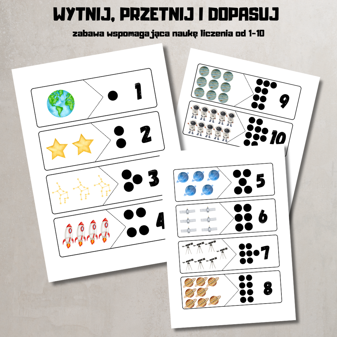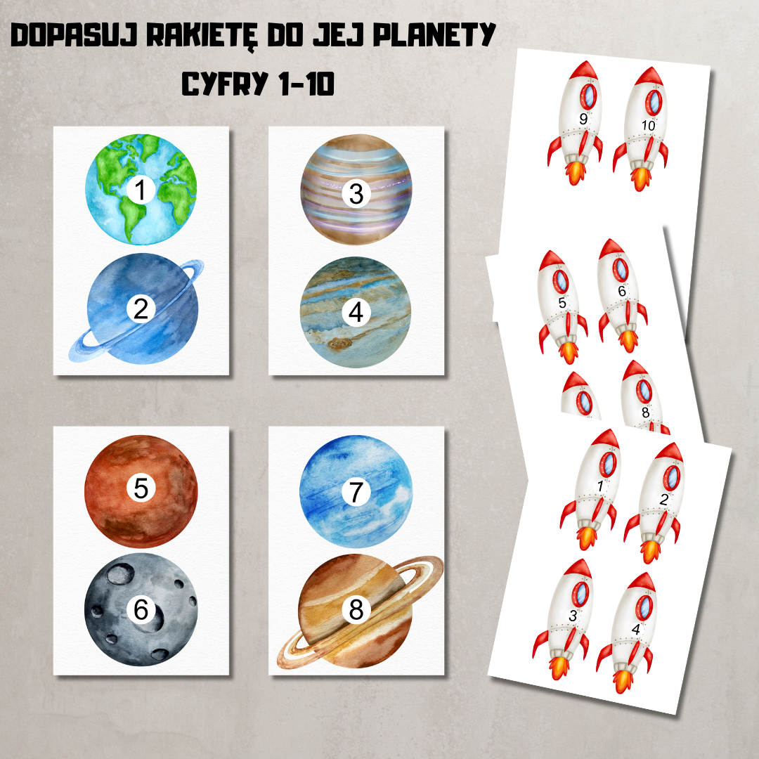 • Zabawa „Dopasuj rakietę do planety” – ćwiczenie matematyczne utrwalające cyfry i liczenie.