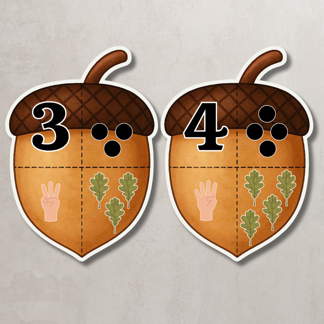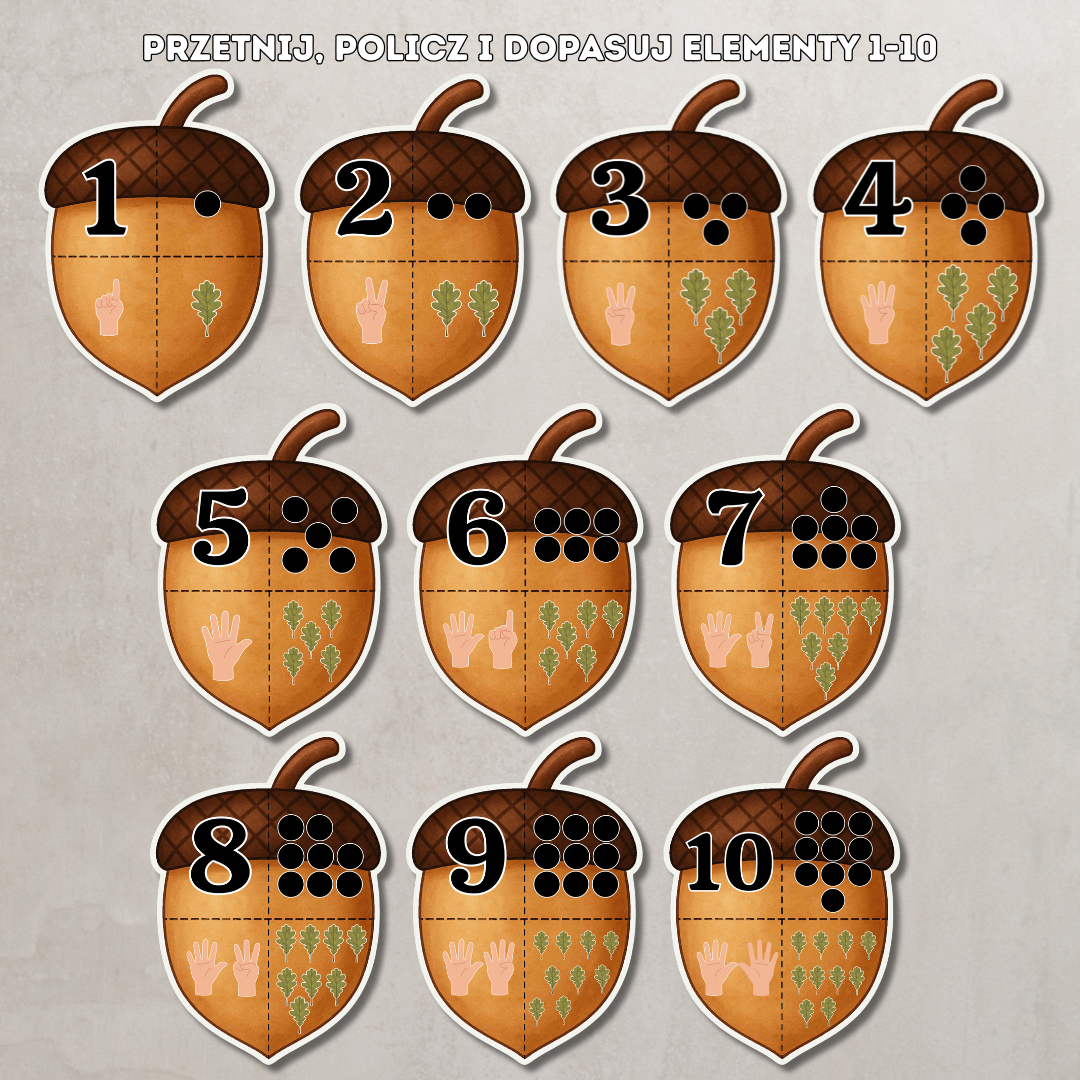 Zestaw edukacyjny w jesiennym klimacie, stworzony z myślą o najmłodszych dzieciach, które uczą się liczyć. Każdy żołądź podzielony jest na cztery części, w których znajdują się różne reprezentacje liczby: cyfra, palce na dłoni, kropki oraz listki dębu. Dzięki temu dzieci w sposób angażujący i multisensoryczny rozwijają umiejętność rozpoznawania i kojarzenia liczb z ich ilością. Zadaniem dziecka jest dopasowanie odpowiednich elementów po ich wycięciu, co wspiera rozwój motoryki małej, koncentracji oraz logicznego myślenia.
