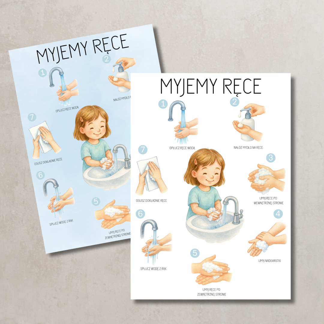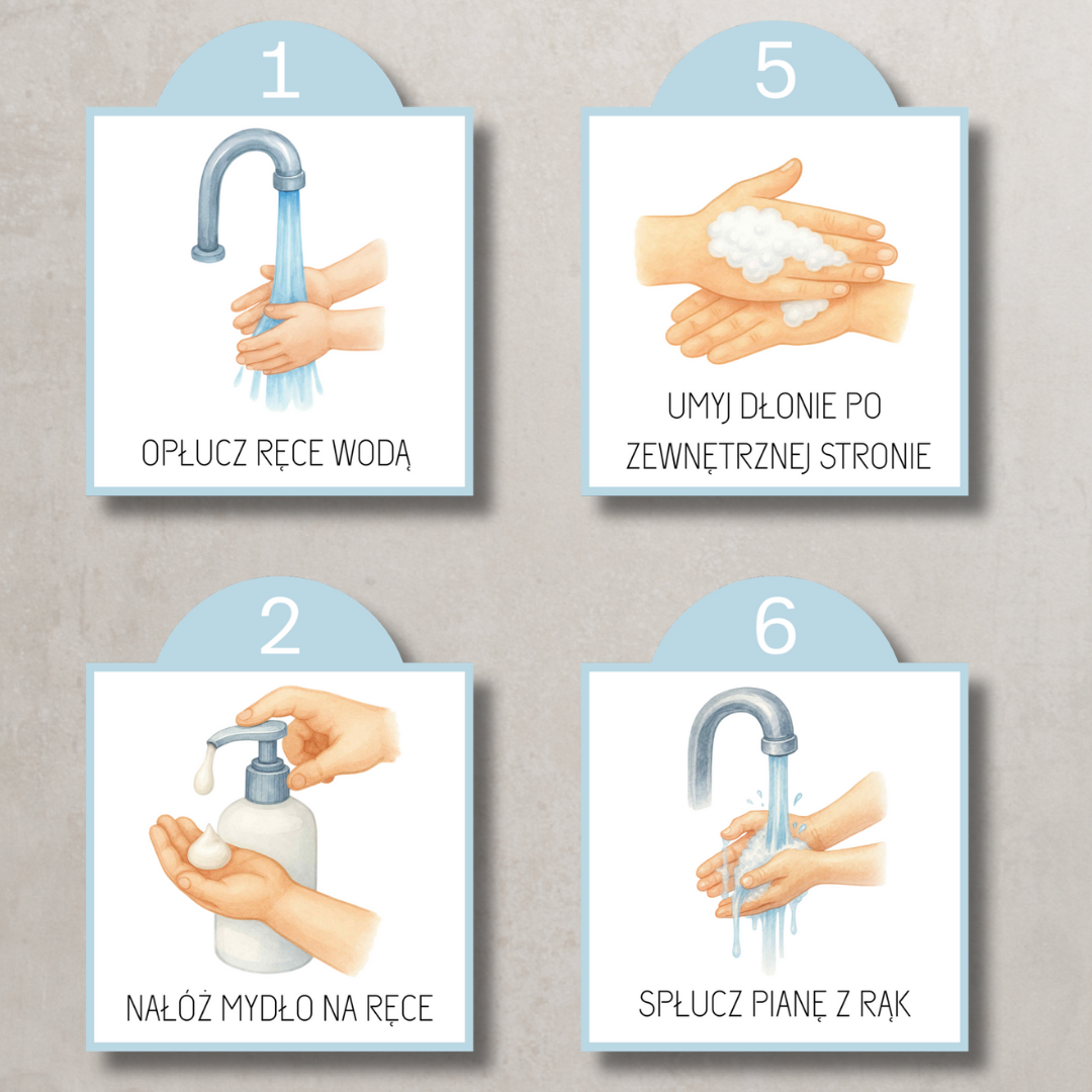 Każdy krok został opisany prostym językiem i zilustrowany czytelnym obrazkiem, dzięki czemu dzieci szybko zapamiętują prawidłową kolejność czynności: od zmoczenia dłoni, przez namydlenie i dokładne mycie, aż po spłukanie piany i osuszenie rąk. Pakiet pomaga kształtować dobre nawyki higieniczne i samodzielność, a jednocześnie stanowi estetyczną dekorację przestrzeni sanitarnej dla najmłodszych.