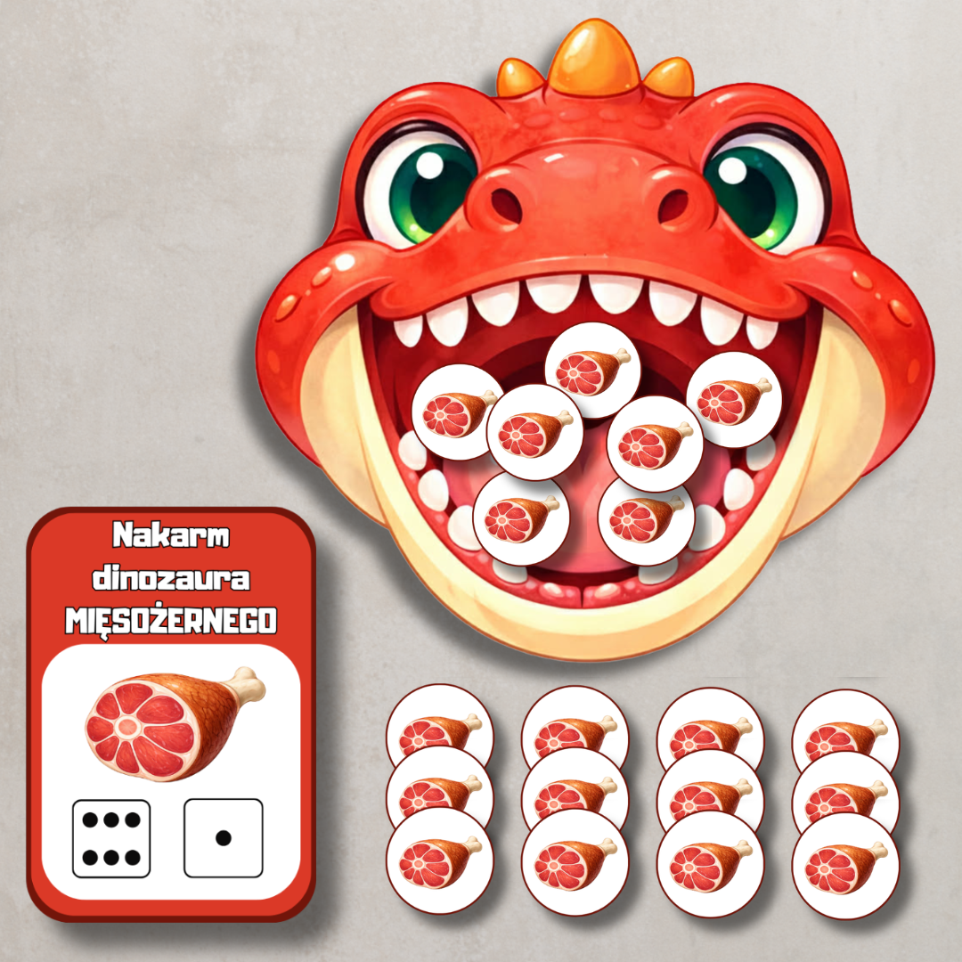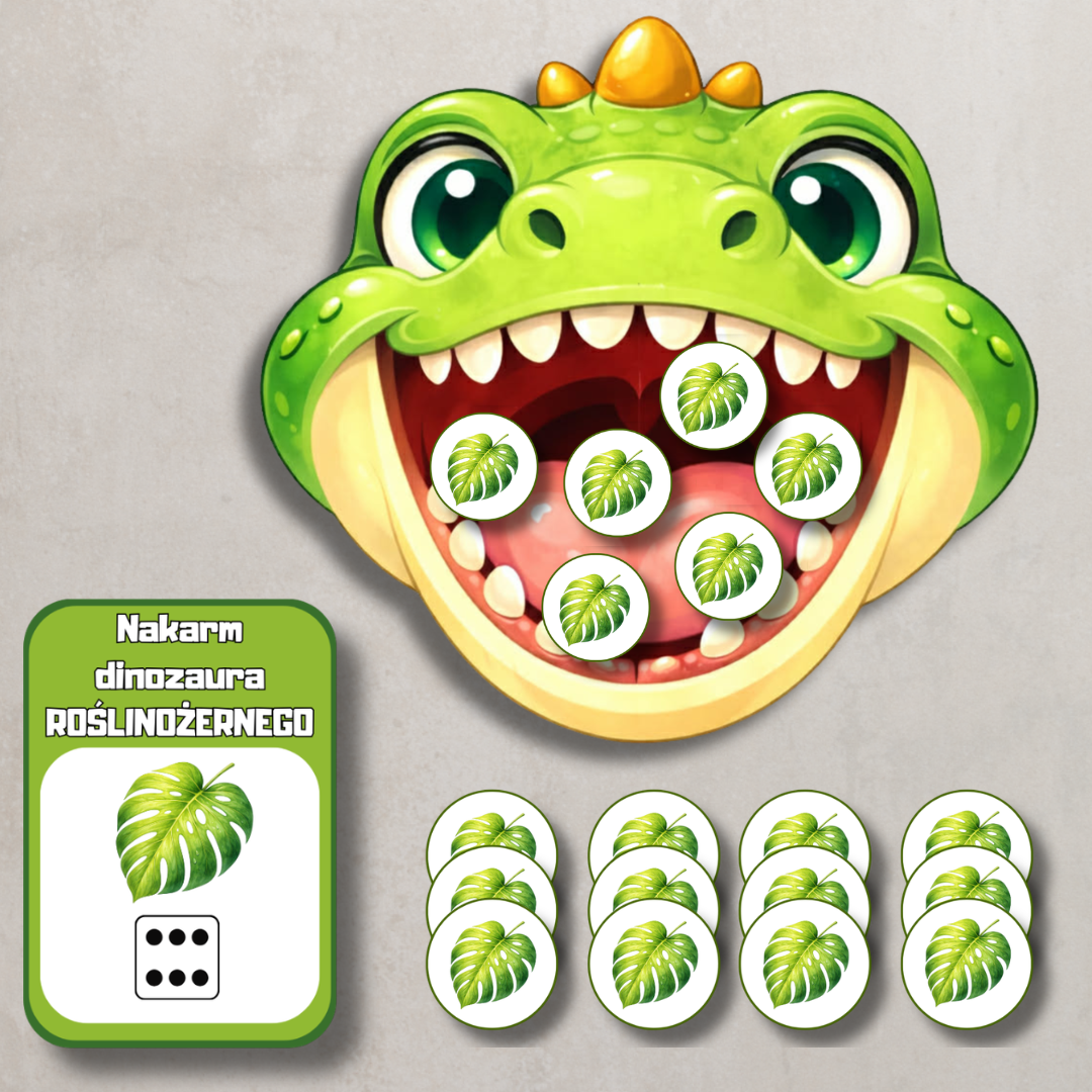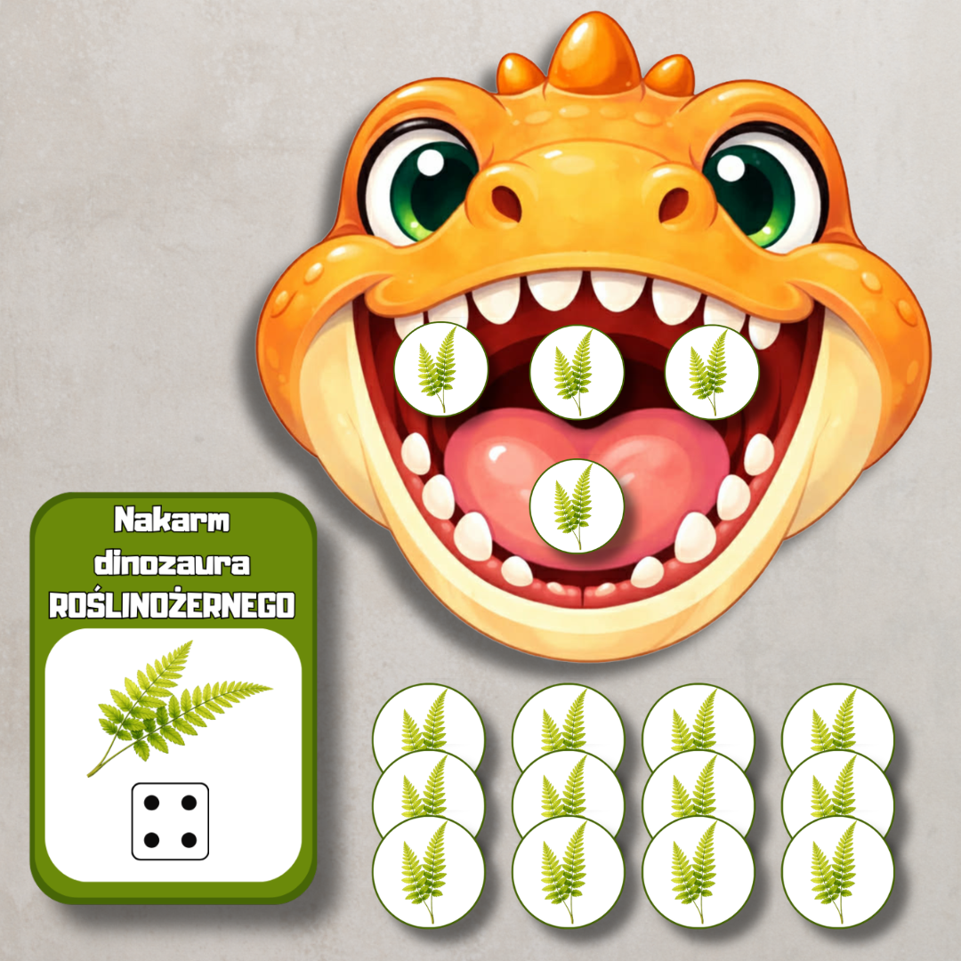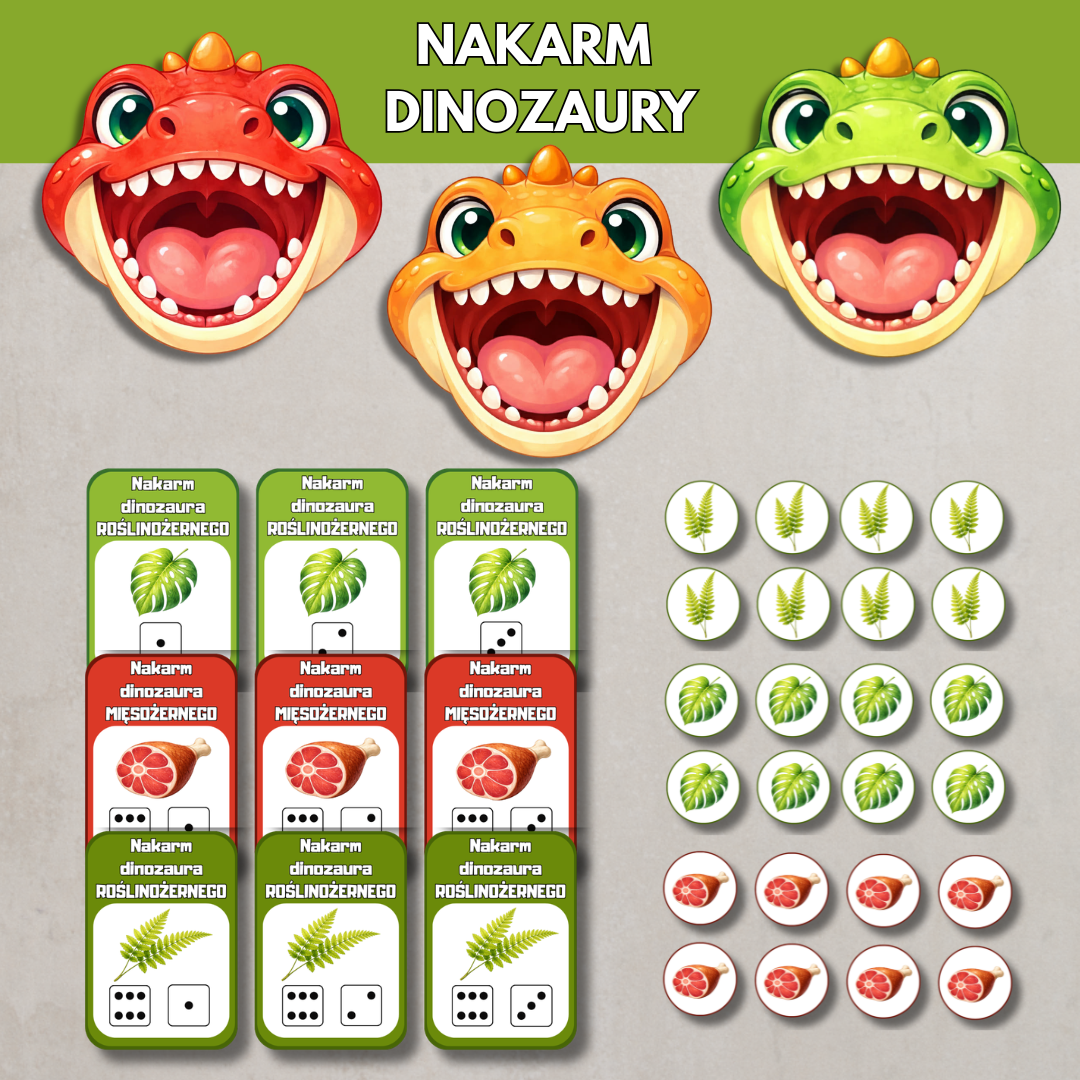 „Nakarm dinozaury” to angażująca pomoc edukacyjna do nauki liczenia w zakresie 1–10, stworzona z myślą o przedszkolakach. Zadaniem dziecka jest nakarmić odpowiedniego dinozaura właściwą liczbą elementów – zgodnie z cyfrą lub ilością oczek na kostce przedstawioną na karcie.