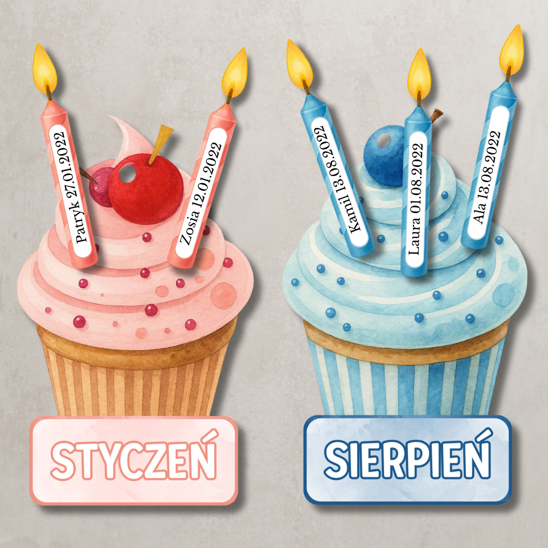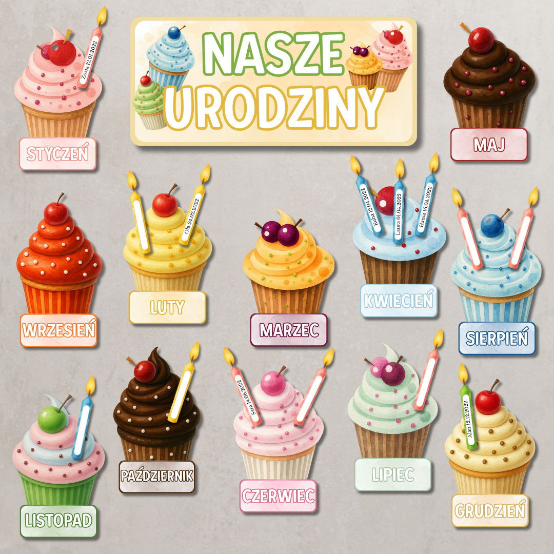 Kolorowy zestaw 12 uroczych babeczek symbolizujących każdy miesiąc roku. Idealny do stworzenia tablicy urodzinowej w przedszkolu lub klasie. Do każdej babeczki można przypiąć świeczki z imionami i datami urodzin dzieci. Zestaw tworzy ciepłą, radosną dekorację, która pomaga świętować wyjątkowe dni w grupie.