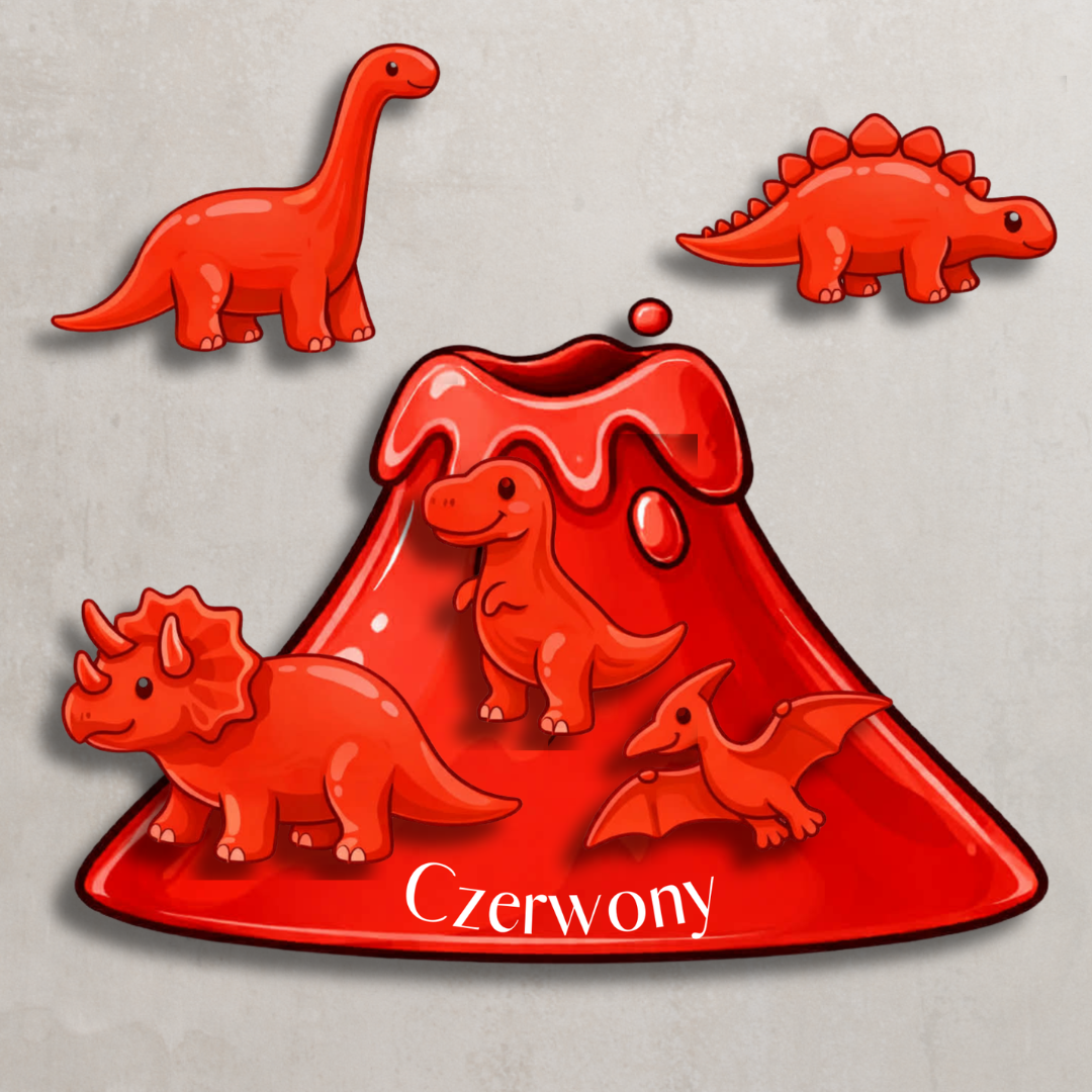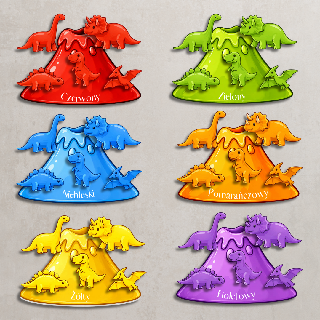 Kolorowy pakiet edukacyjny wspierający naukę rozpoznawania i utrwalania kolorów poprzez zabawę w dopasowywanie. Zadaniem dziecka jest przyporządkowanie dinozaurów do wulkanów w odpowiednim kolorze.