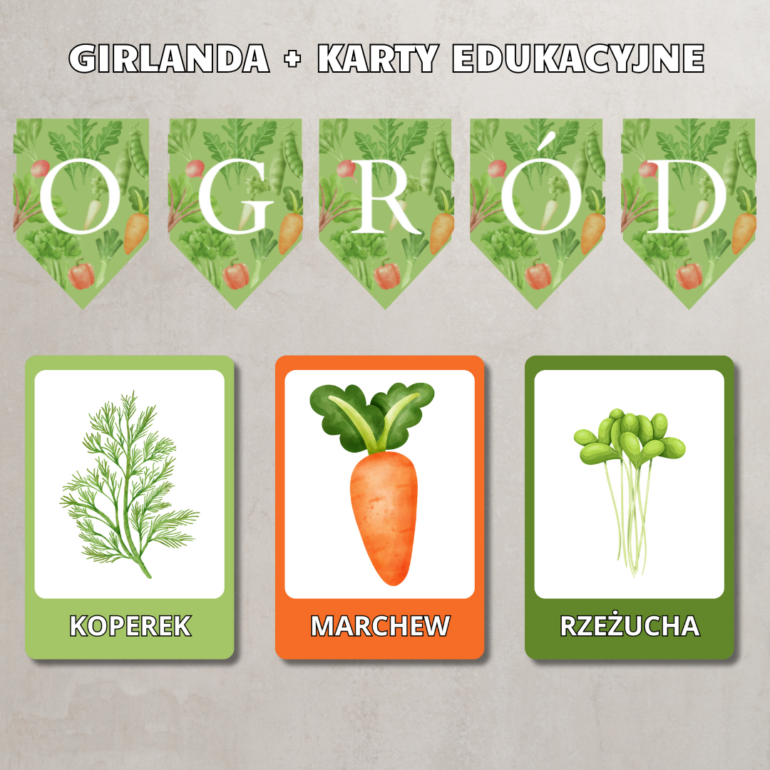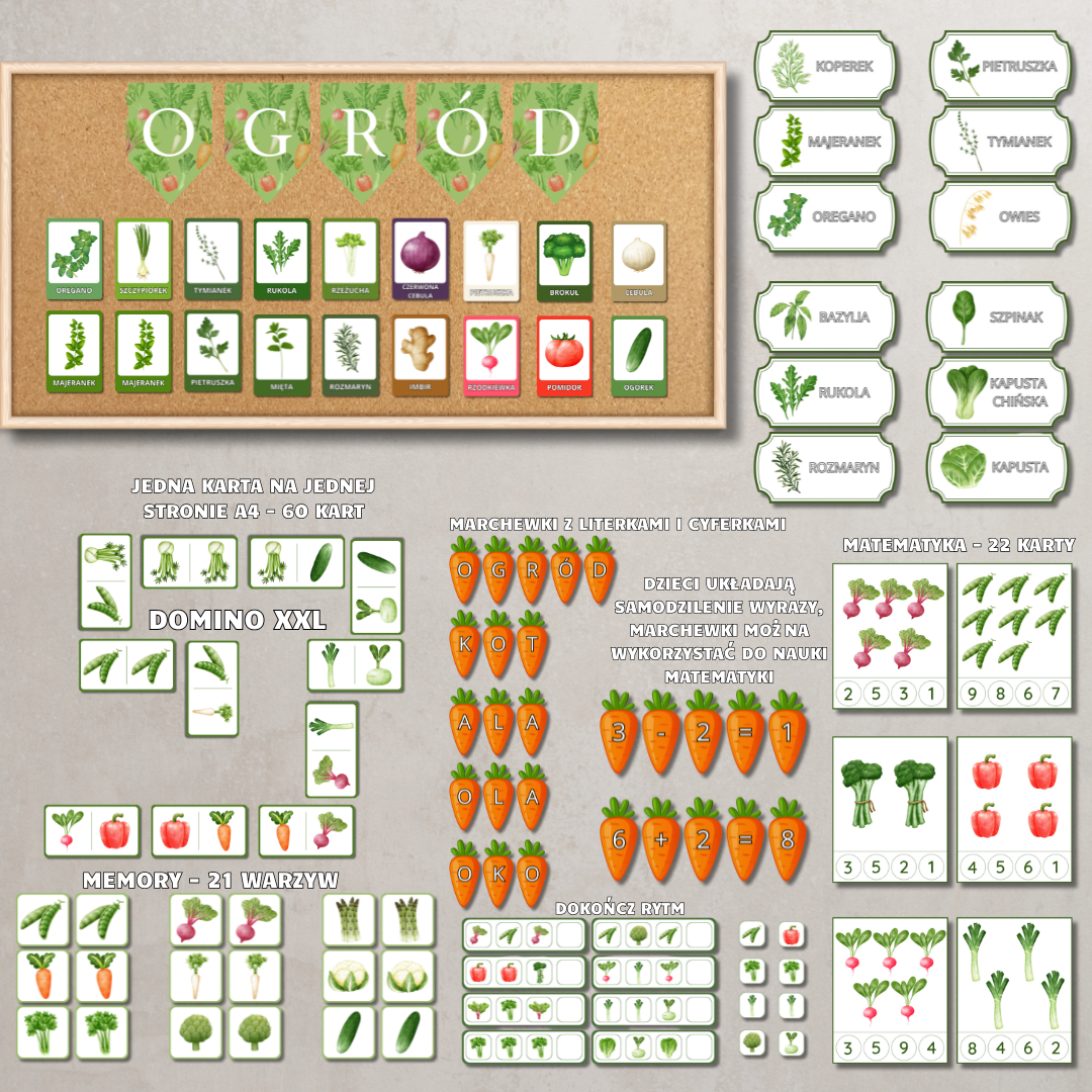 Pakiet „Ogród” to kompleksowy zestaw materiałów edukacyjnych wspierających naukę o warzywach, owocach i ziołach. Został przygotowany z myślą o pracy z dziećmi w wieku przedszkolnym i wczesnoszkolnym. Dzięki atrakcyjnym ilustracjom i różnorodnym aktywnościom dzieci poznają świat roślin w sposób ciekawy, angażujący i pełen zabawy.