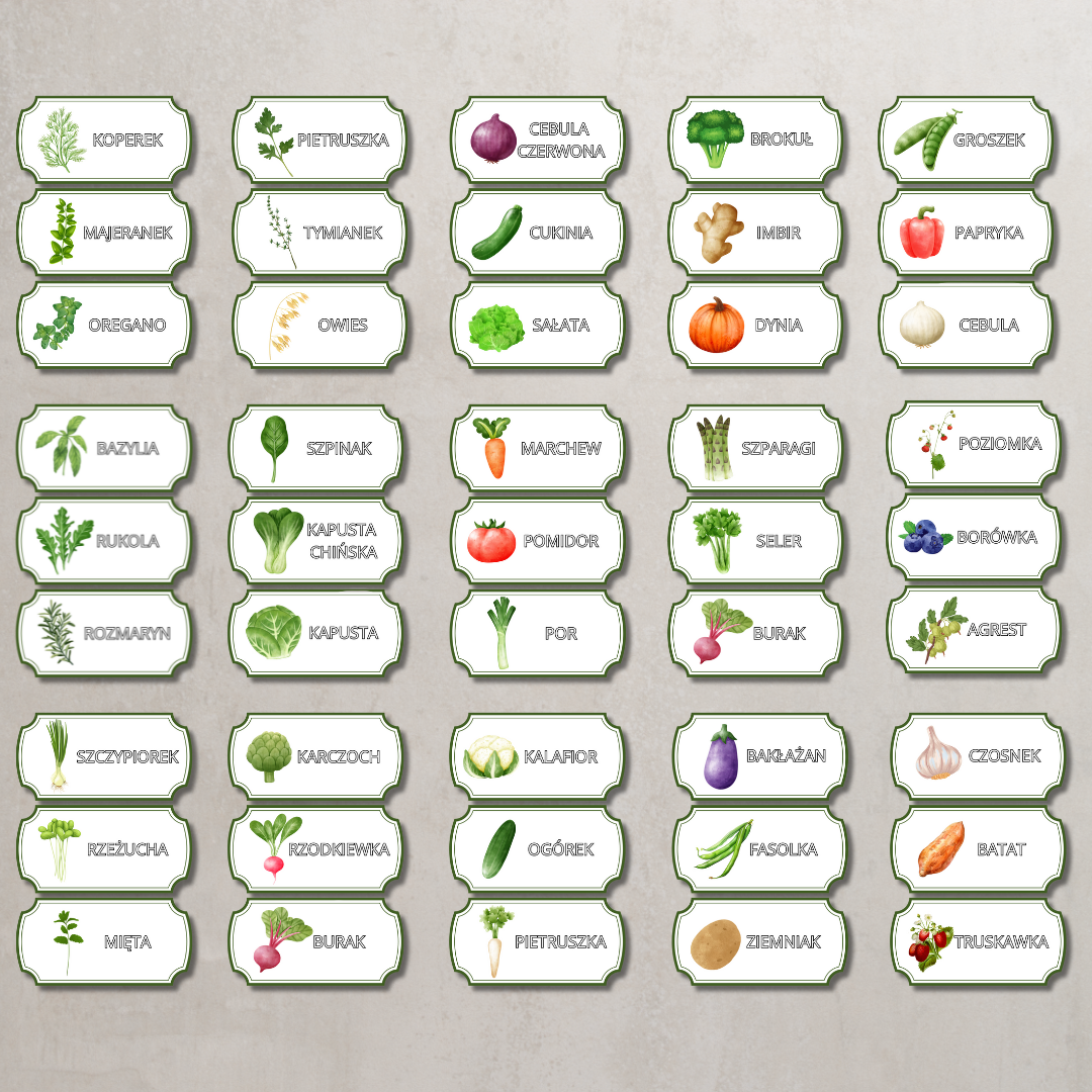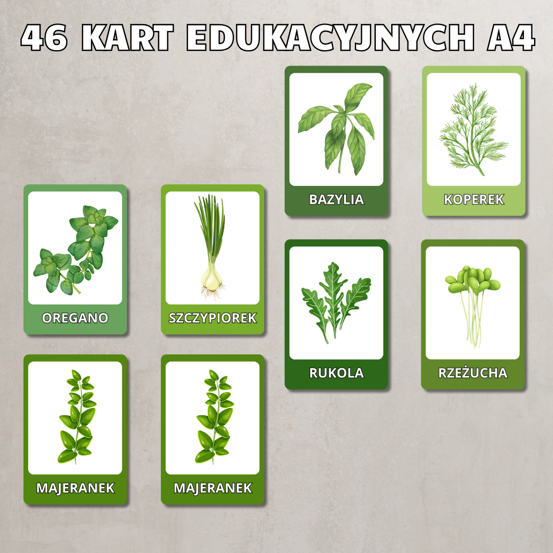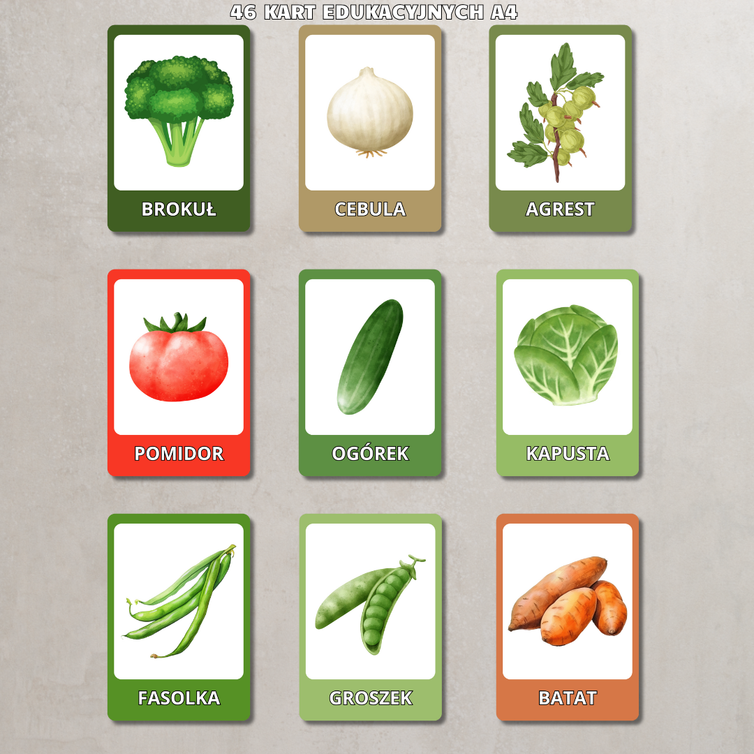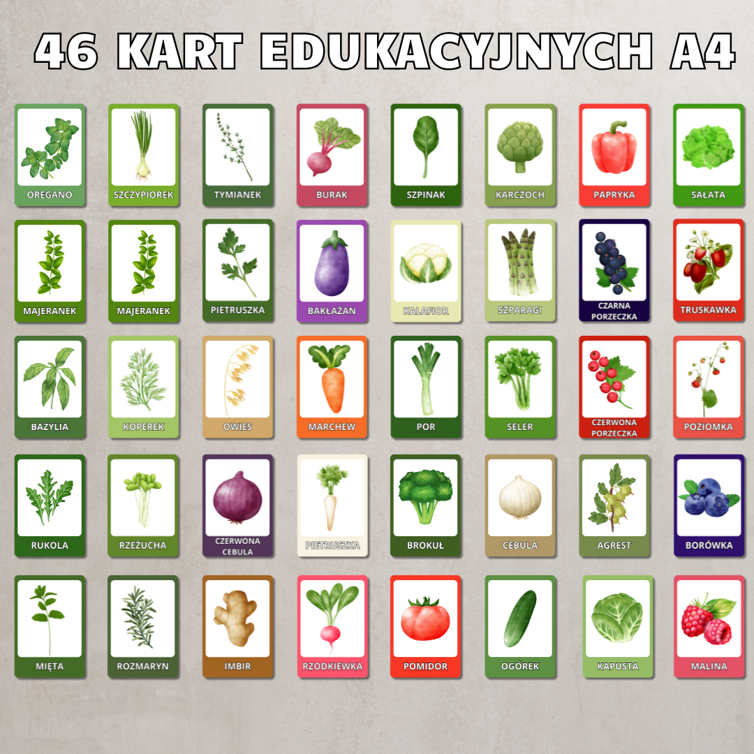 1. Karty edukacyjne A4 – 46 sztuk Kolorowe karty z realistycznymi ilustracjami warzyw, owoców i ziół. Każda karta zawiera nazwę rośliny i obraz ułatwiający zapamiętywanie. Przykładowe hasła: marchew, pietruszka, pomidor, koper, bazylia, truskawka, borówka, mięta, imbir.