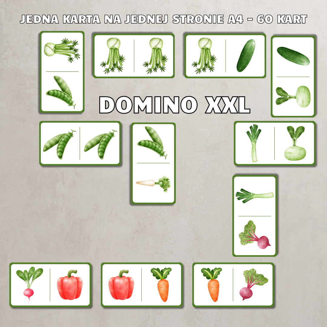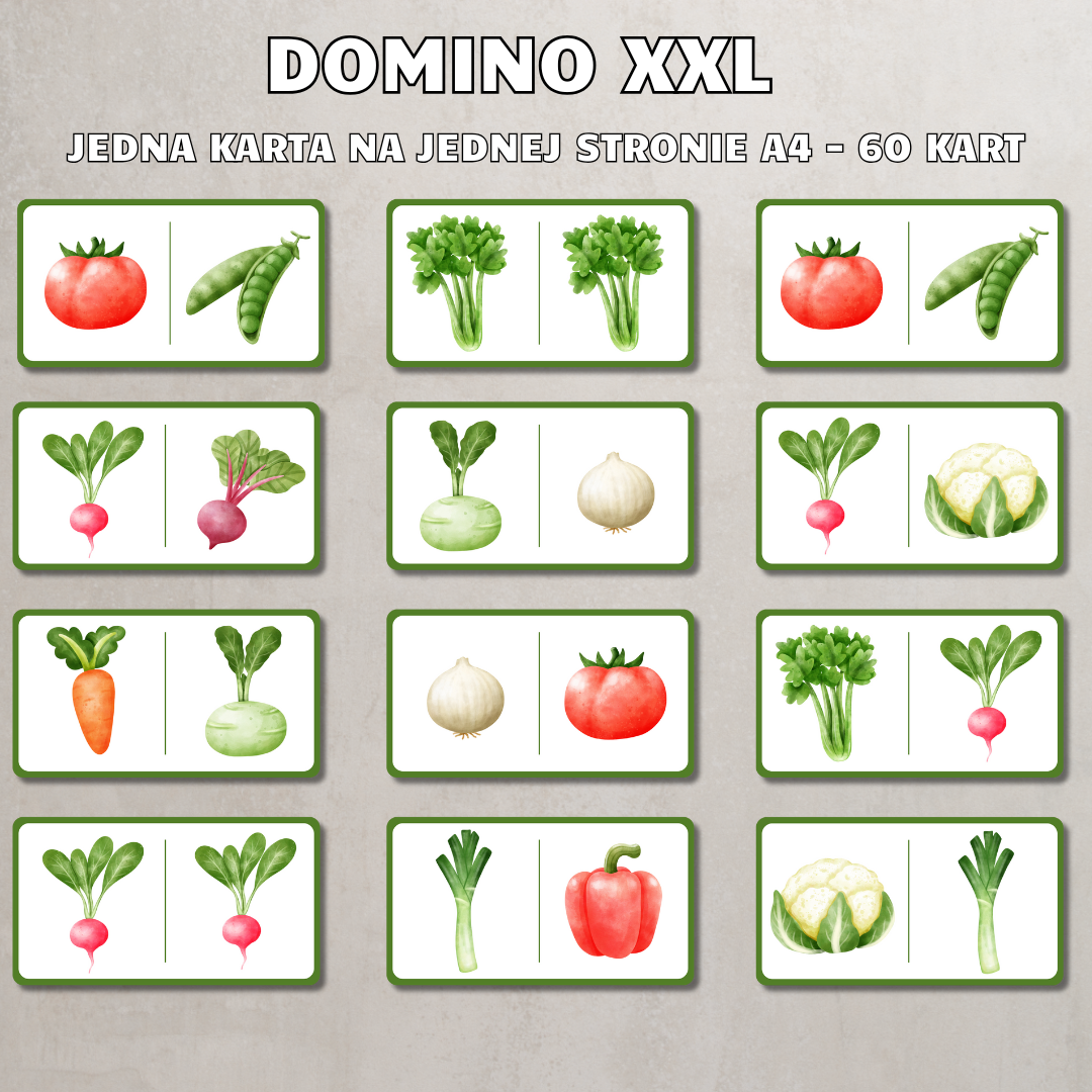 3. Domino XXL – 60 kart Gra rozwijająca spostrzegawczość i logiczne myślenie. Zadaniem dzieci jest dopasowanie obrazków przedstawiających takie same warzywa.