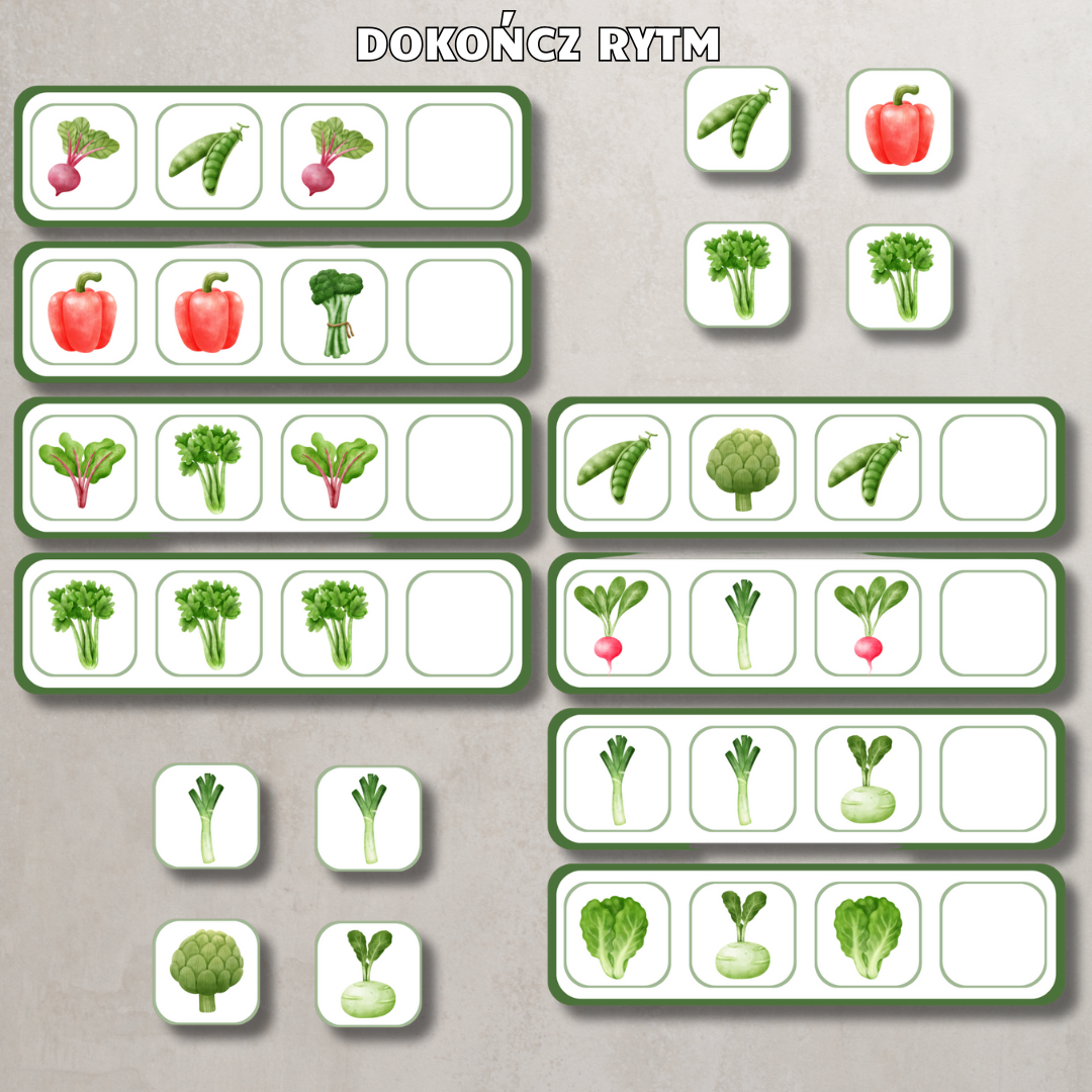 7. Zabawa „Dokończ rytm” – 12 kart Ćwiczenie rozwijające logiczne myślenie i percepcję wzrokową – dzieci uzupełniają sekwencje obrazków zgodnie z powtarzającym się schematem.