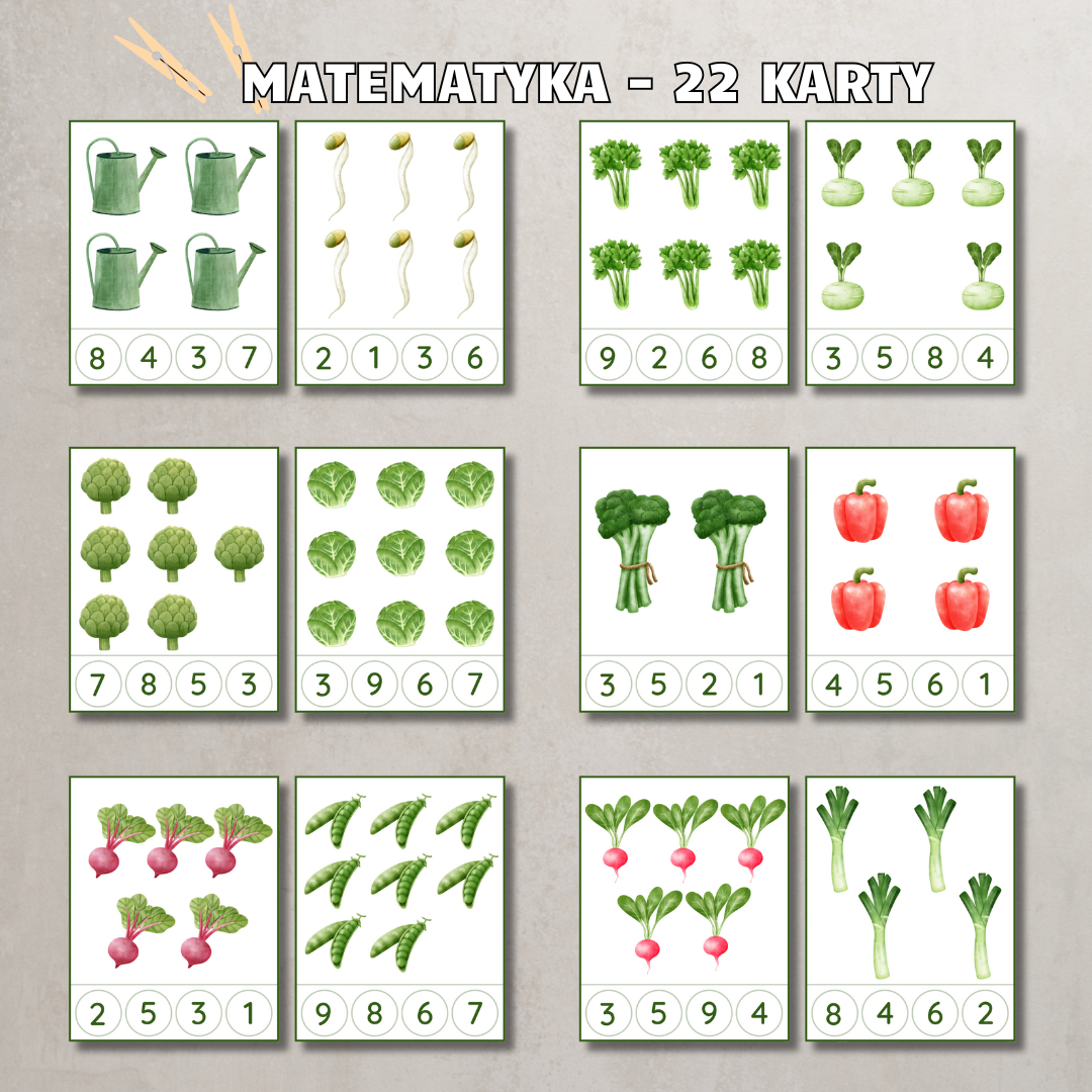 6. Karty matematyczne – 22 sztuki Zadania rozwijające umiejętności liczenia, porównywania i utrwalania cyfr w kontekście tematyki ogrodu.