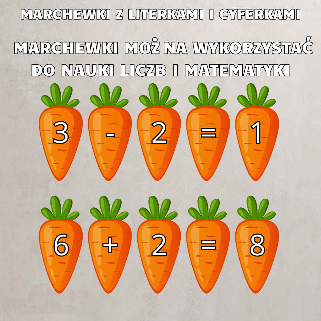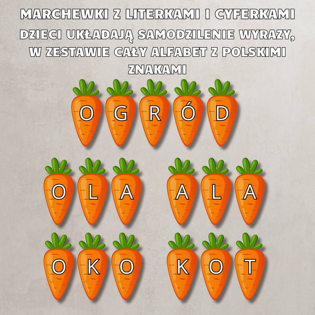 5. Marchewki z literami i cyframi – 26 sztuk Wielofunkcyjny zestaw do nauki liter, tworzenia prostych wyrazów i utrwalania cyfr. Można wykorzystać do zabaw matematycznych lub językowych.
