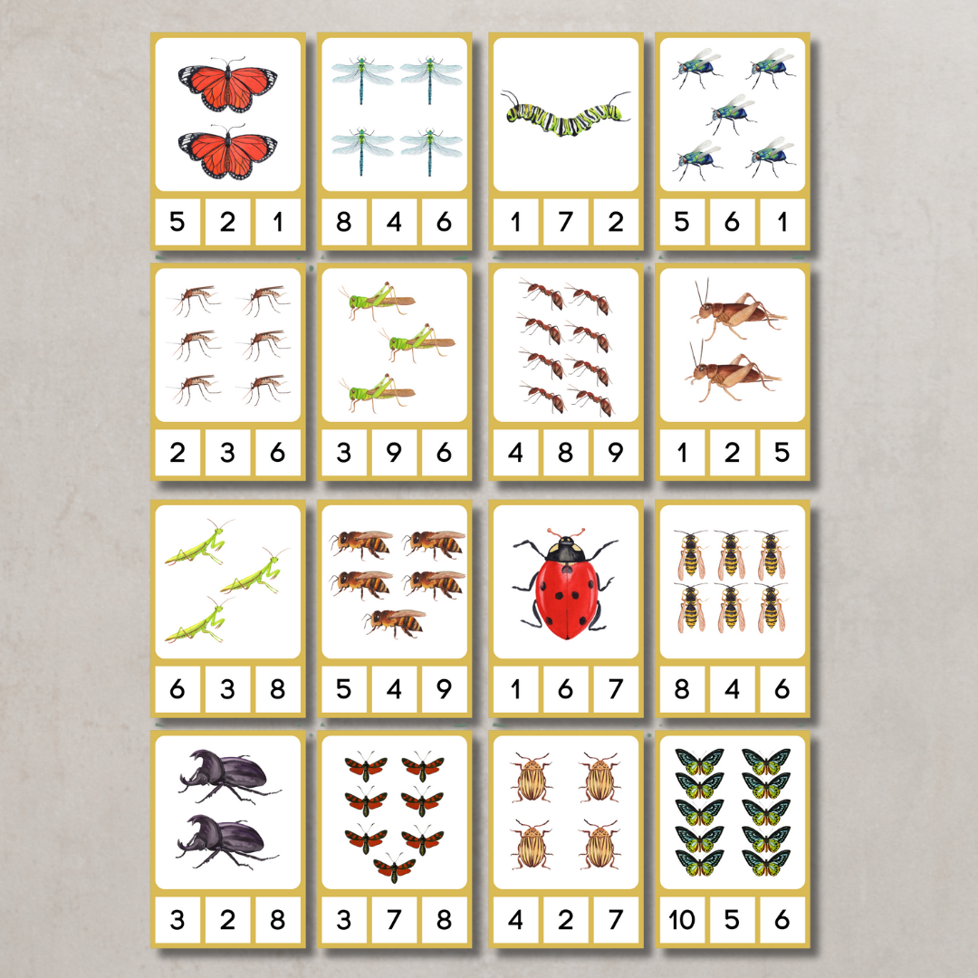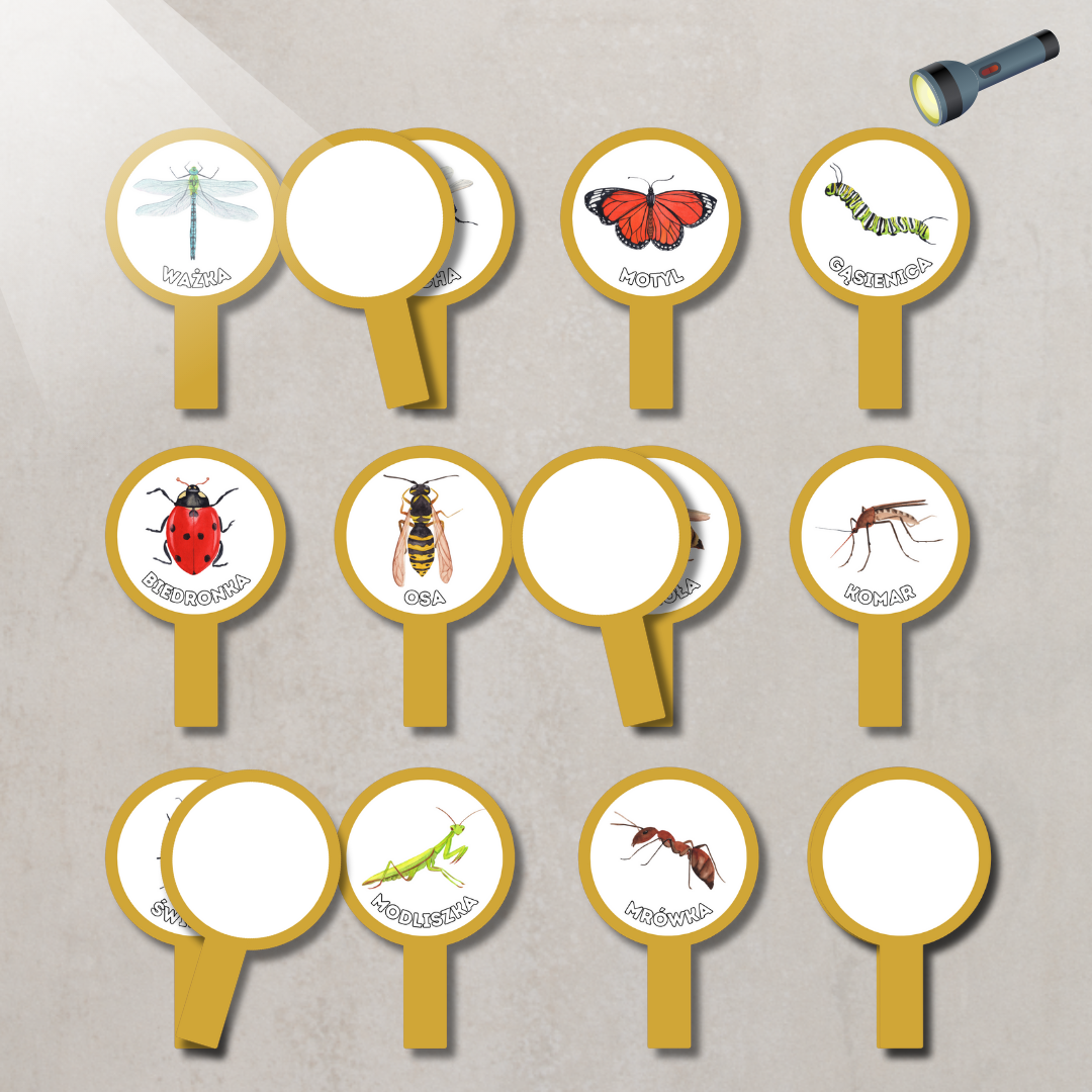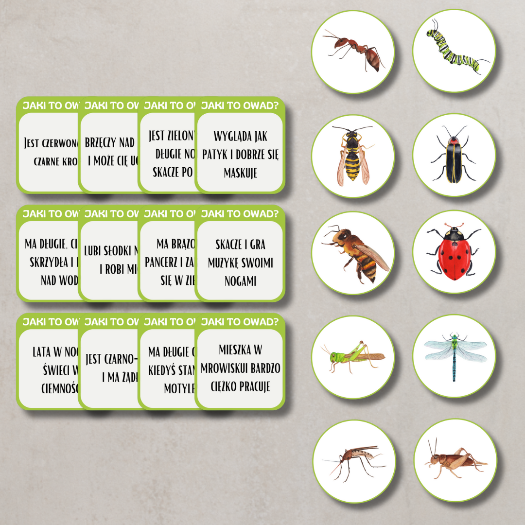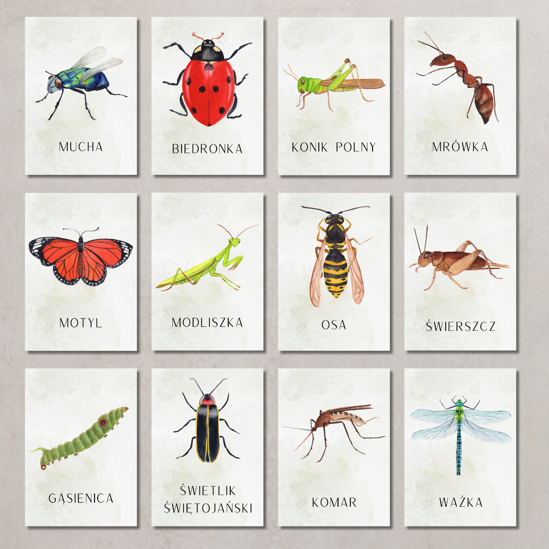• Karty edukacyjne – zestaw ilustracji przedstawiających różne gatunki owadów wraz z nazwami