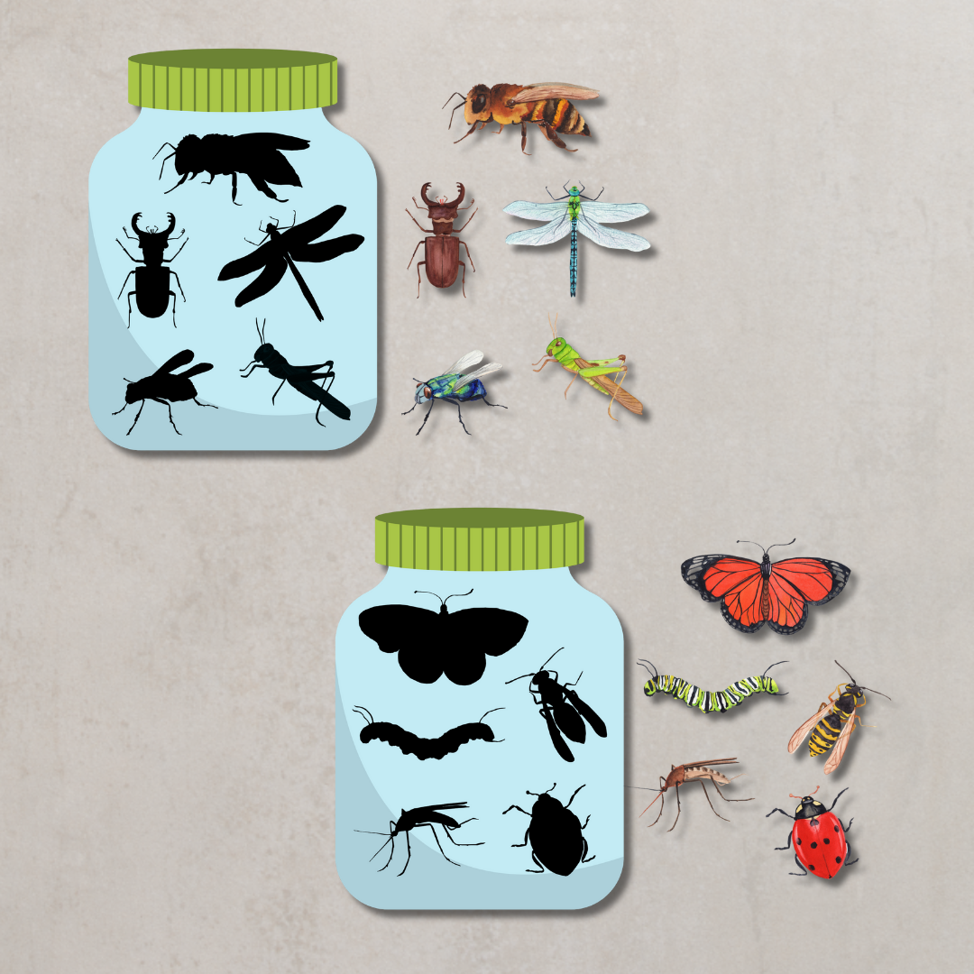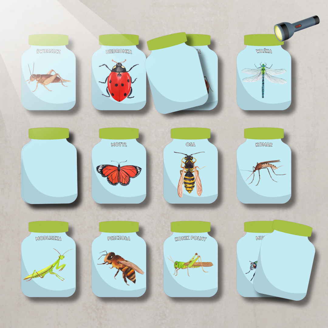 • Słoiki z owadami – zabawa w dopasowywanie cieni do odpowiednich ilustracji owadów