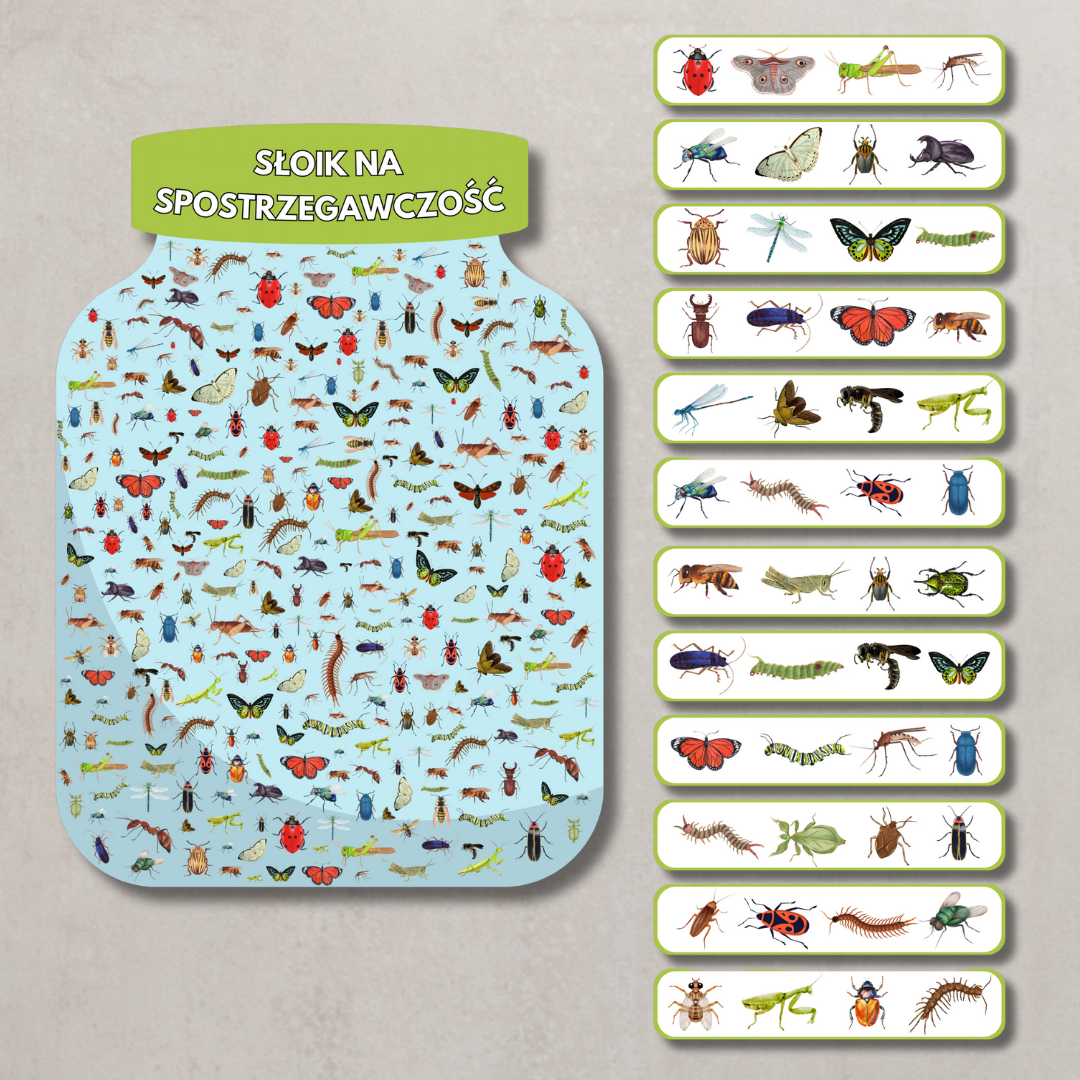• Słoik na spostrzegawczość – duża plansza z ukrytymi owadami do wyszukiwania i ćwiczenia koncentracji