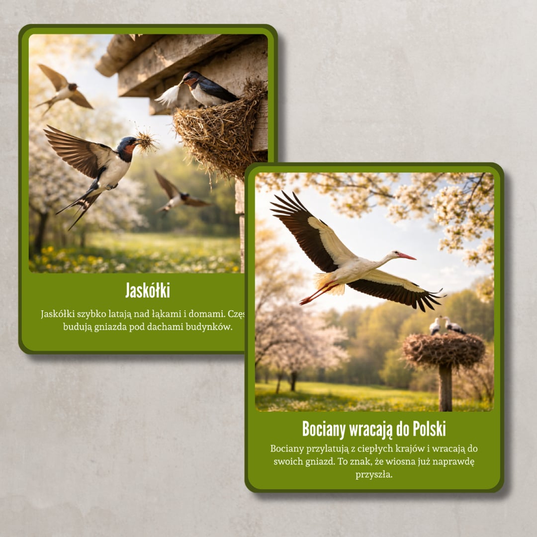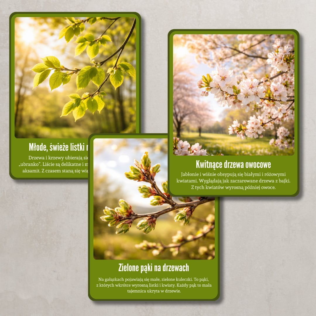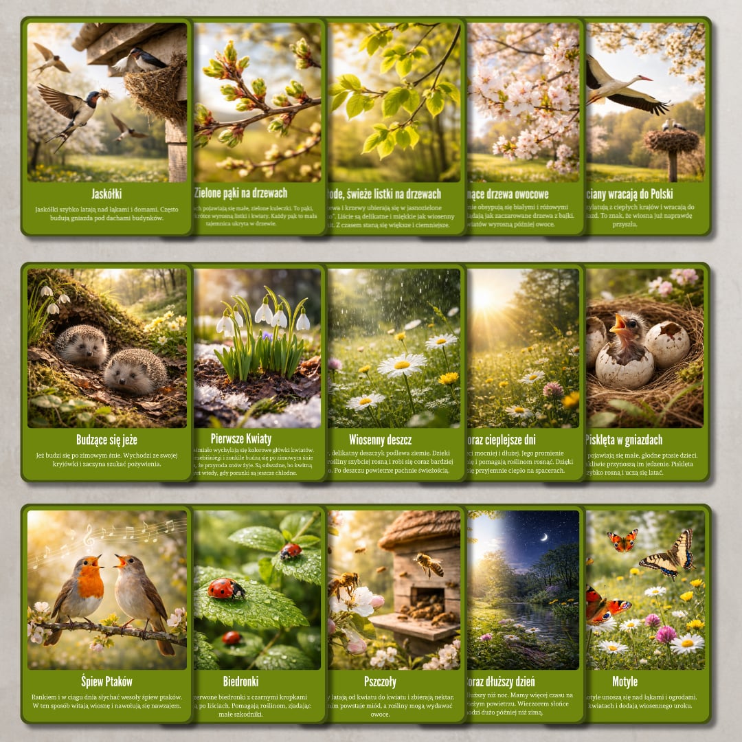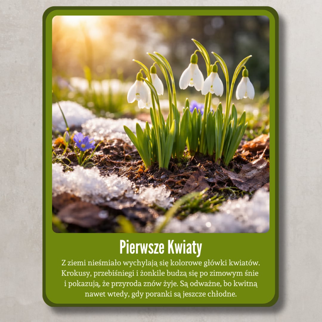 Zestaw pięknych, realistycznych kart edukacyjnych przedstawiających pierwsze oznaki wiosny. Każda karta zawiera wyraźne zdjęcie oraz krótki, zrozumiały opis dostosowany do dzieci w wieku przedszkolnym i wczesnoszkolnym. Materiał wspiera rozwój słownictwa, obserwację przyrody oraz rozmowy kierowane.