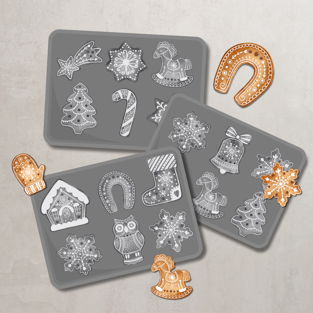 Zimowy zestaw edukacyjny inspirowany zapachem świątecznych pierników, idealny do zabaw rozwijających spostrzegawczość, logiczne myślenie i motorykę małą.
