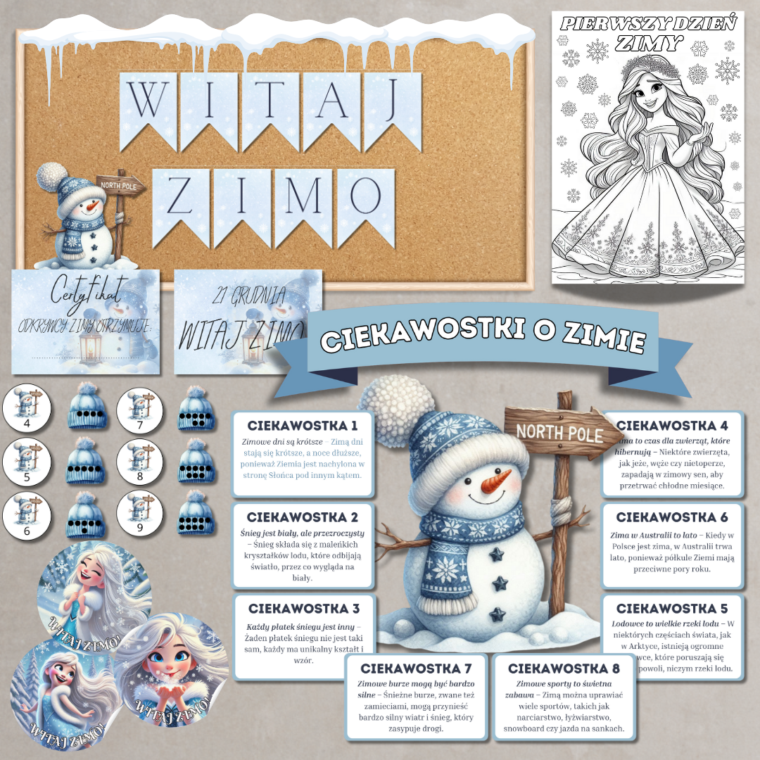 Pakiet edukacyjno-dekoracyjny „Pierwszy Dzień Zimy” Kompletny zestaw materiałów dydaktycznych i dekoracyjnych, który pomoże zorganizować ciekawe zajęcia oraz wprowadzić zimowy klimat w sali.