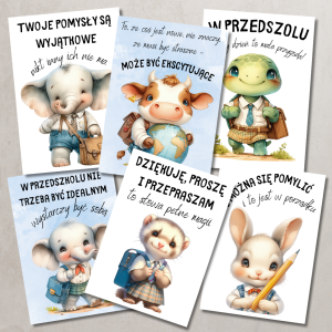 • kolorowe ilustracje zwierzątek z przesłaniem wspierającym dzieci
