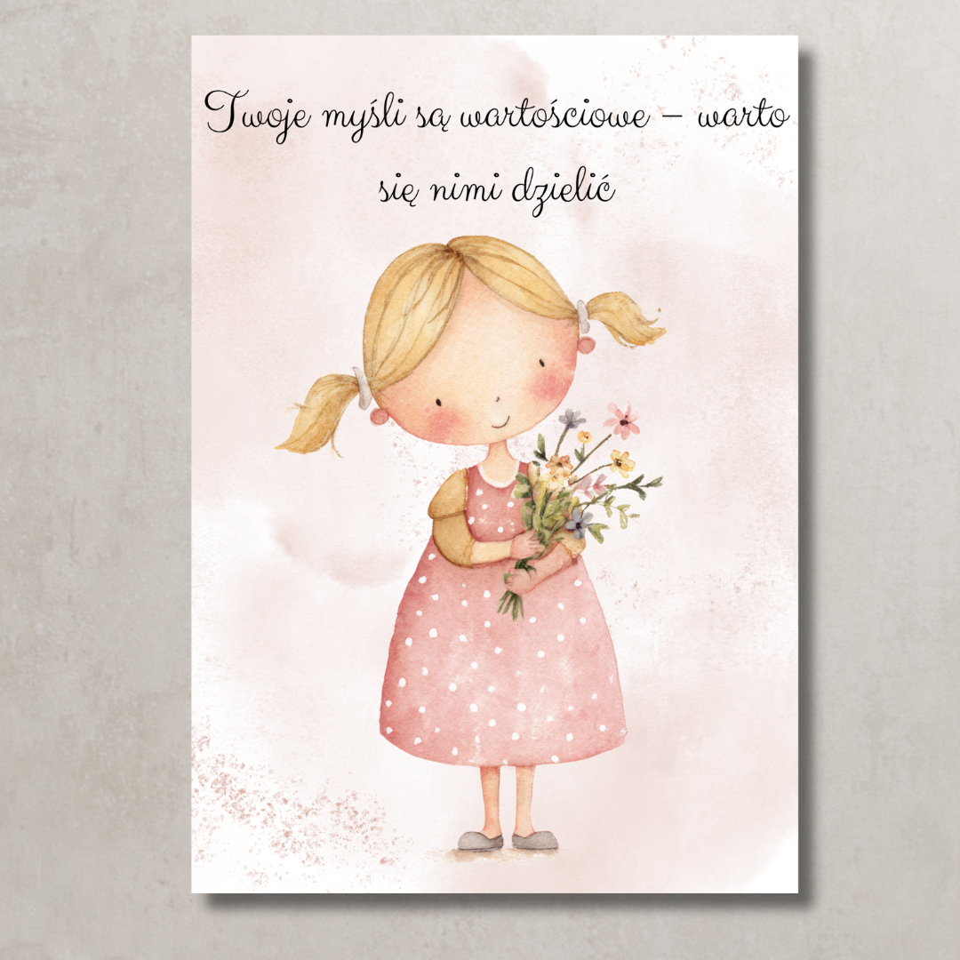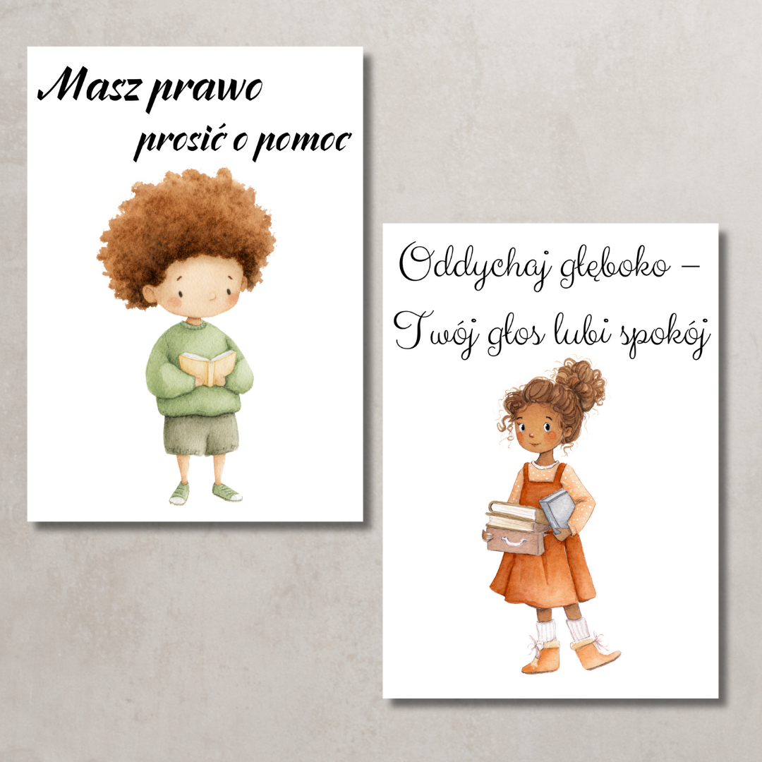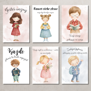 Zestaw 10 delikatnych, pełnych ciepła plakatów z przesłaniami wspierającymi rozwój emocjonalny i poczucie wartości dzieci. Każdy plakat przypomina o szacunku, empatii i wierze w siebie, pomagając budować pozytywną atmosferę w grupie.