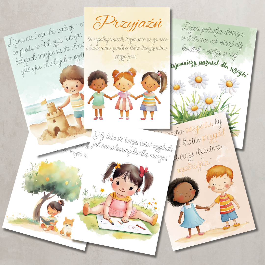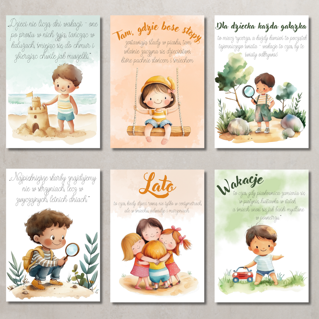 Każdy plakat zawiera krótkie, inspirujące cytaty o wakacjach, przyjaźni i dzieciństwie, które idealnie sprawdzą się jako ozdoba sali, kącika relaksacyjnego lub tablicy sezonowej.