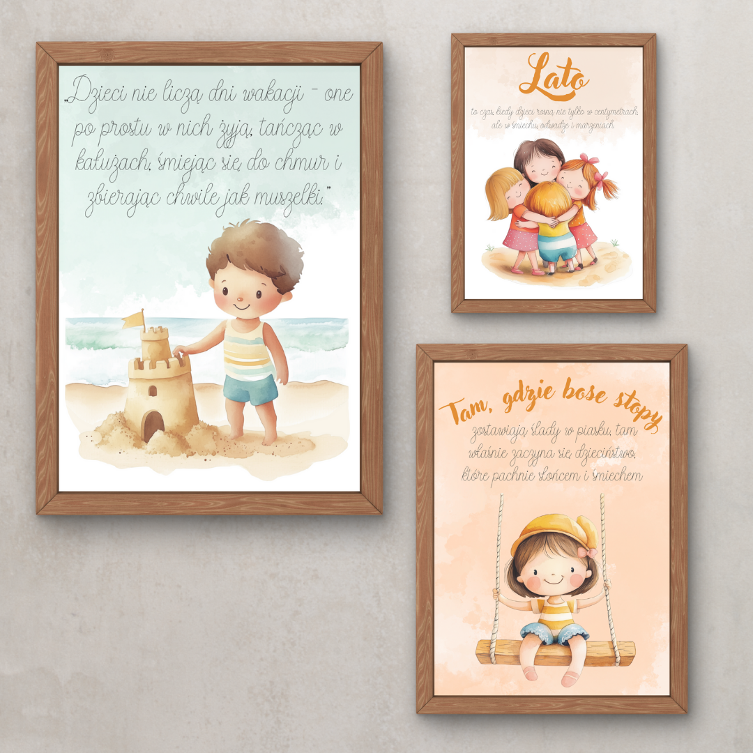 Zestaw 13 pięknych, letnich plakatów stworzonych z myślą o dekoracji sali przedszkolnej, szkolnej lub świetlicy. Ilustracje przedstawiają beztroskie dziecięce zabawy, przyjaźń i radość lata, wszystko w delikatnych pastelowych kolorach, które wprowadzają do wnętrza ciepło i pozytywny nastrój.