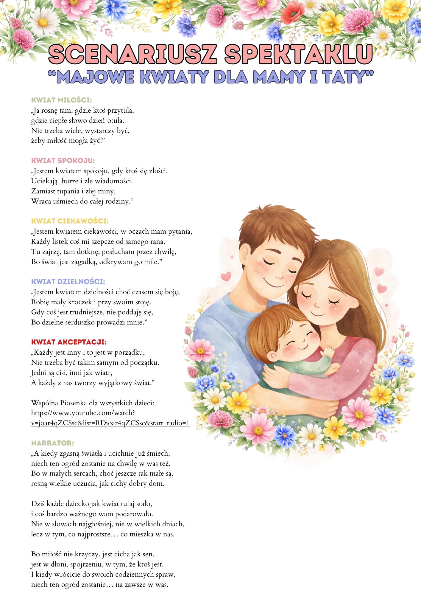 „Majowe kwiaty dla Mamy i Taty” to wzruszający spektakl na Dzień Rodziny, w którym dzieci wcielają się w 24 kwiaty, symbole emocji i wartości, takich jak miłość, przyjaźń czy zaufanie.