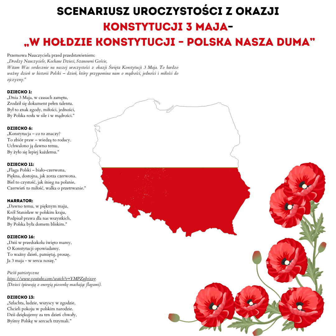 Scenariusz uroczystości z okazji Konstytucji 3 Maja „W hołdzie Konstytucji – Polska nasza duma” Patriotyczny i wzruszający scenariusz przedstawienia przygotowany z myślą o najmłodszych uczniach i przedszkolakach. W prosty, obrazowy sposób wprowadza dzieci w tematykę Święta Konstytucji 3 Maja, ucząc miłości do ojczyzny, szacunku do symboli narodowych i dumy z polskiej historii. Spektakl łączy elementy poetyckie, narracyjne i muzyczne, dzieci recytują wiersze, śpiewają piosenki patriotyczne oraz uczestniczą w krótkich inscenizacjach. Całość utrzymana jest w podniosłym, ale jednocześnie przystępnym i radosnym tonie, odpowiednim dla wieku przedszkolnego i wczesnoszkolnego.