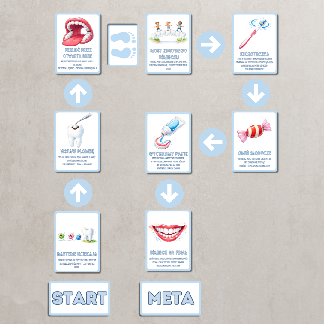 - Ruchowa gra podłogowa z zadaniami: mycie zębów, omijanie słodyczy, wstawianie plomby, ucieczka bakterii. Łączy edukację zdrowotną z aktywnością fizyczną. Pakiet wspiera realizację tematyki zawodów, profilaktyki zdrowotnej oraz kształtowania prawidłowych nawyków higienicznych.