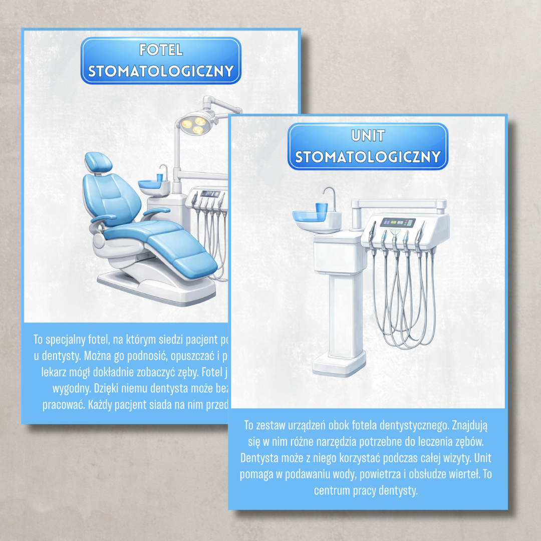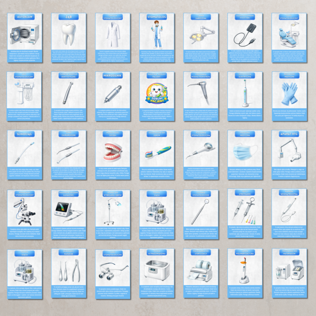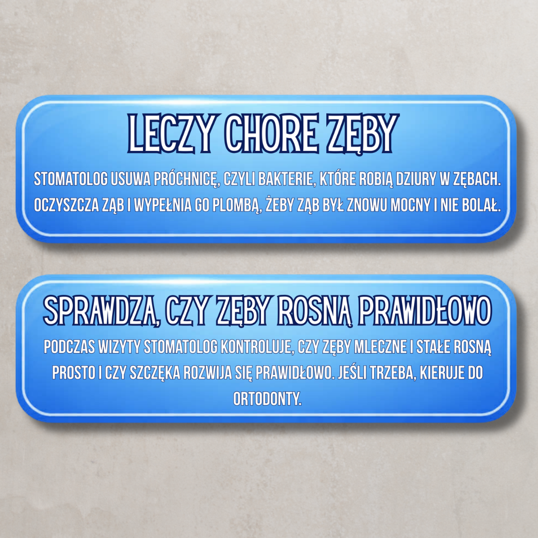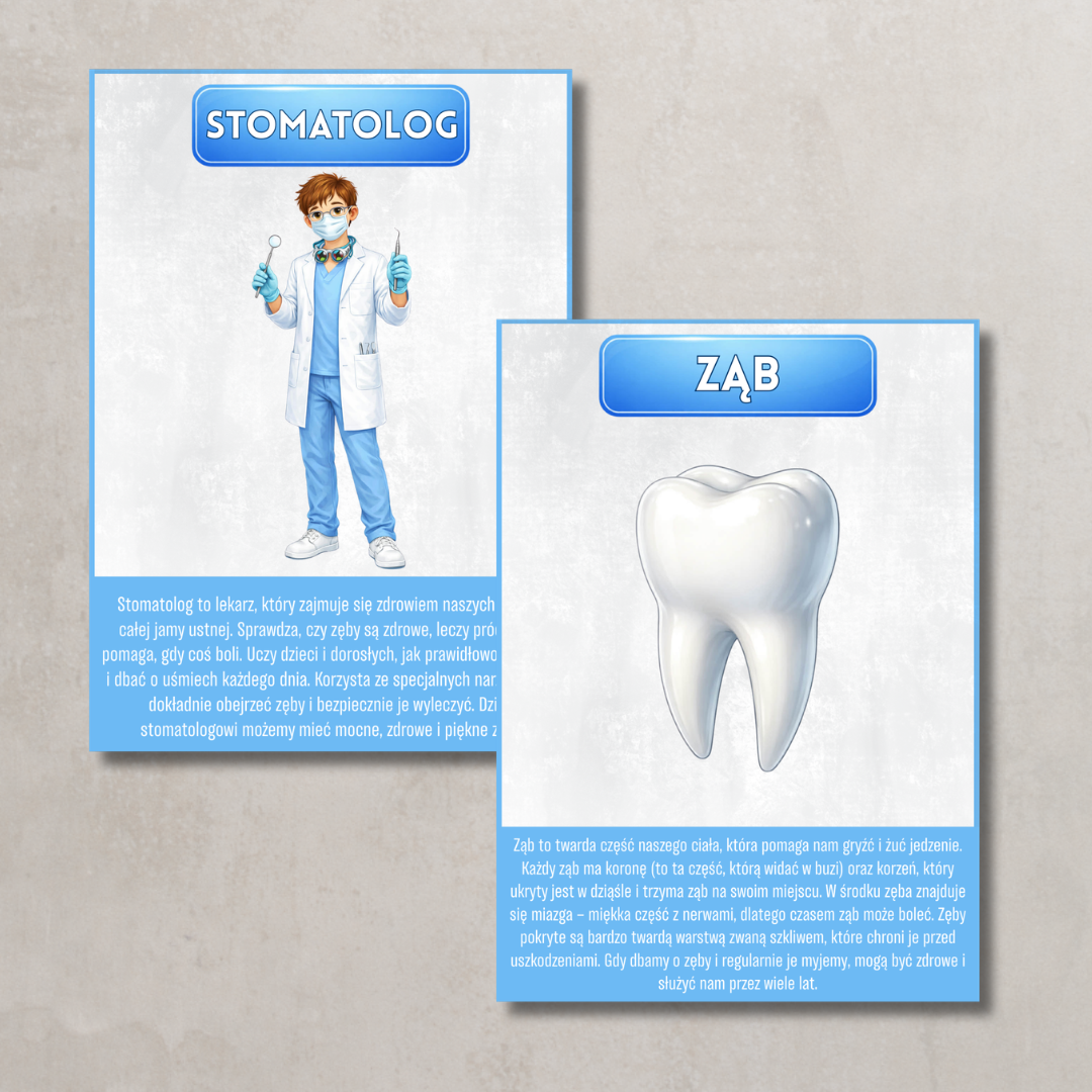 - Karty edukacyjne Estetyczne plansze wyjaśniające, czym zajmuje się stomatolog, jak dbać o zęby oraz jakie narzędzia wykorzystuje w swojej pracy. Proste, zrozumiałe treści dostosowane do dzieci.