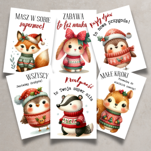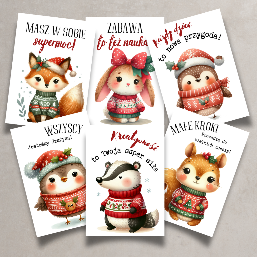 Zestaw 10 uroczych plakatów z zimowymi zwierzątkami w świątecznych sweterkach i pozytywnymi hasłami motywacyjnymi. Idealne do dekoracji sali, kącika zimowego lub tablicy motywacyjnej.