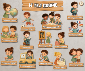 • 18 grafik z ilustracjami dzieci (np. uczymy się, dbamy o porządek, jesteśmy życzliwi, działamy wspólnie, odkrywamy świat),