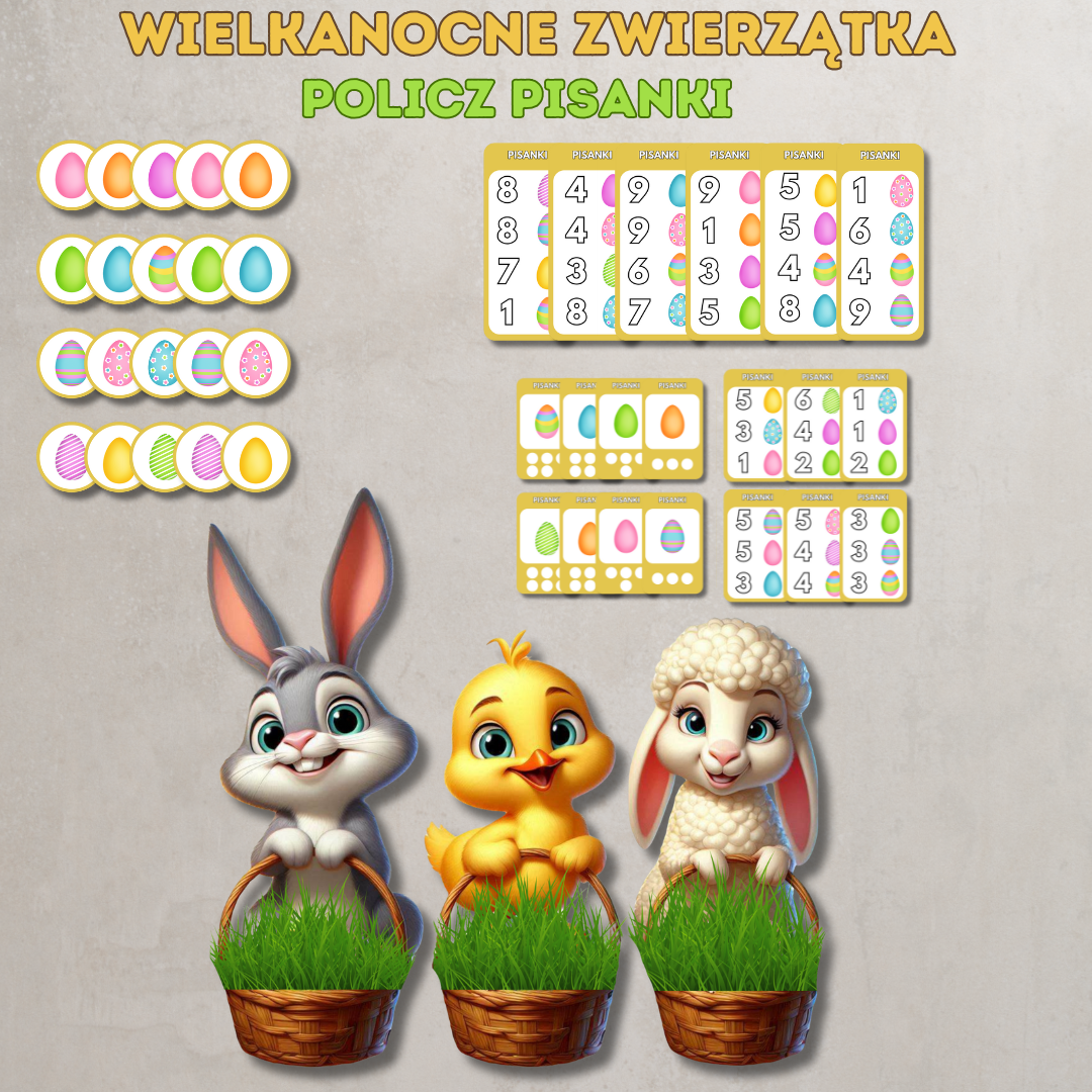 Zestaw „Wielkanocne zwierzątka – Policz pisanki” to kolorowa gra matematyczna dla dzieci, rozwijająca umiejętność liczenia, spostrzegawczość i koncentrację. W towarzystwie uroczego zajączka, kurczaczka i owieczki najmłodsi uczą się poprzez zabawę, dopasowując kolorowe pisanki do odpowiednich kart z zadaniami.