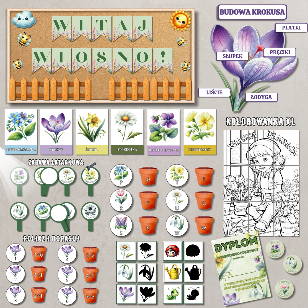 Kompletny pakiet materiałów edukacyjnych i dekoracyjnych na powitanie wiosny. Zestaw doskonale sprawdzi się w przedszkolu i klasach 1–3, łącząc naukę z zabawą i twórczą aktywnością dzieci.