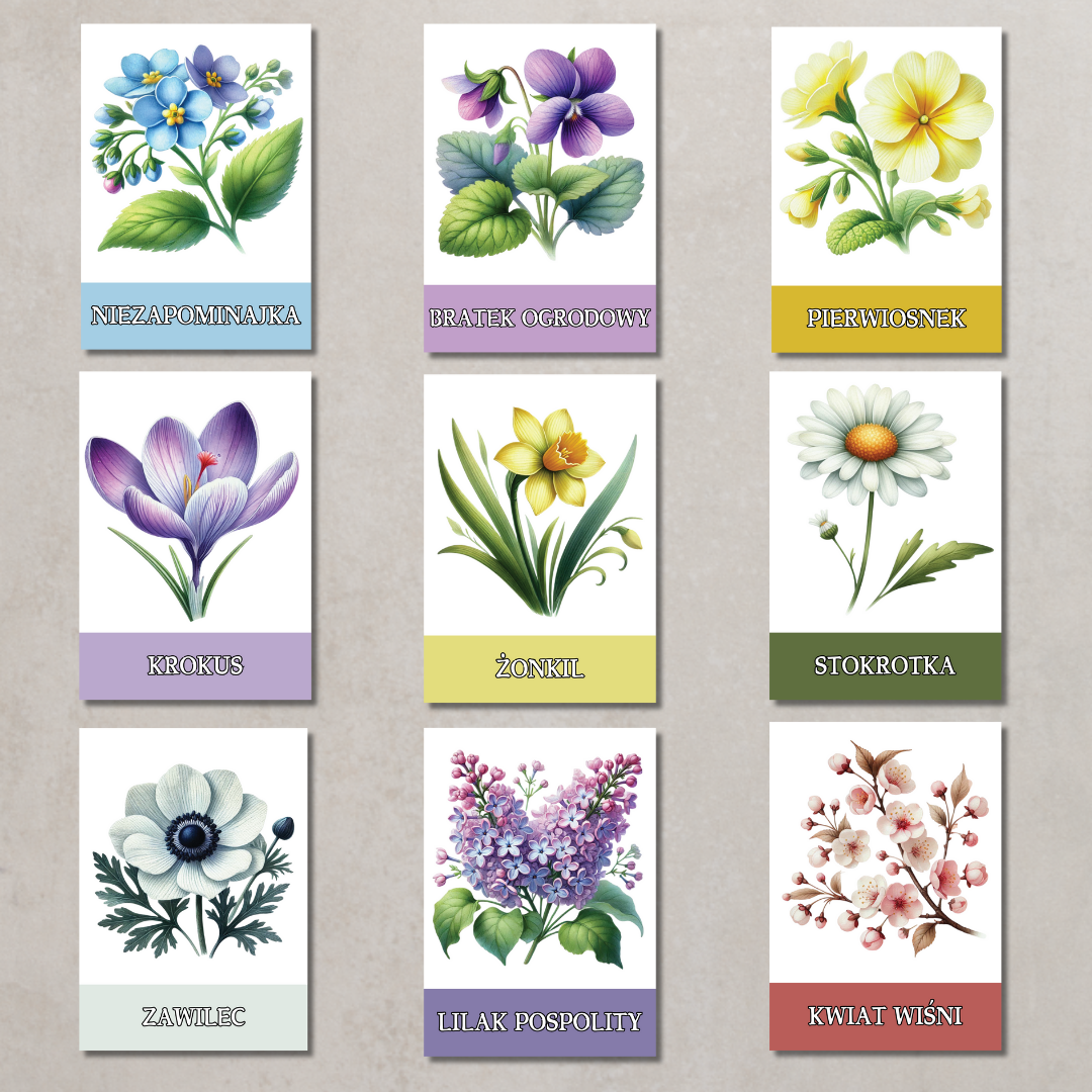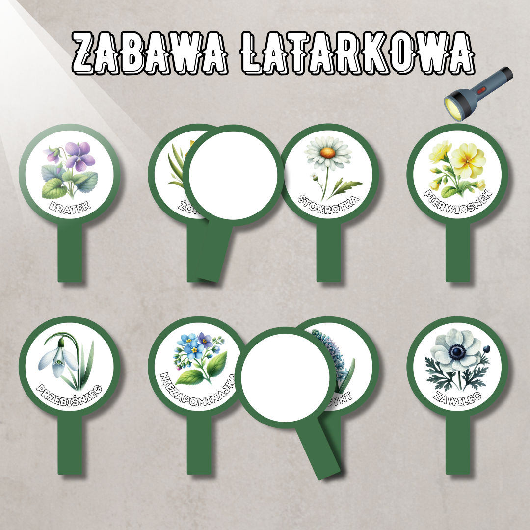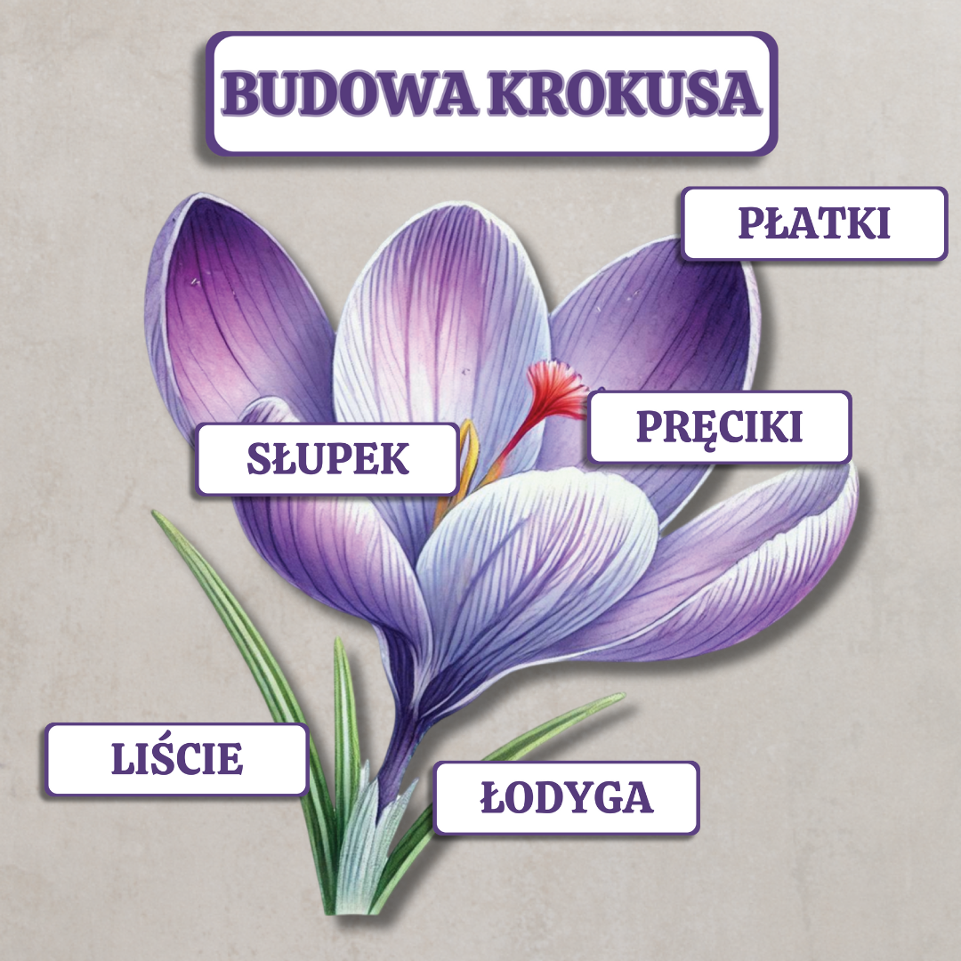 • Karty edukacyjne – KWIATY WIOSENNE (m.in. krokus, żonkil, stokrotka, zawilec, niezapominajka, pierwiosnek) • Budowa krokusa – plansza z podpisanymi częściami rośliny • Zabawa latarkowa – dopasowywanie nazw do ilustracji kwiatów