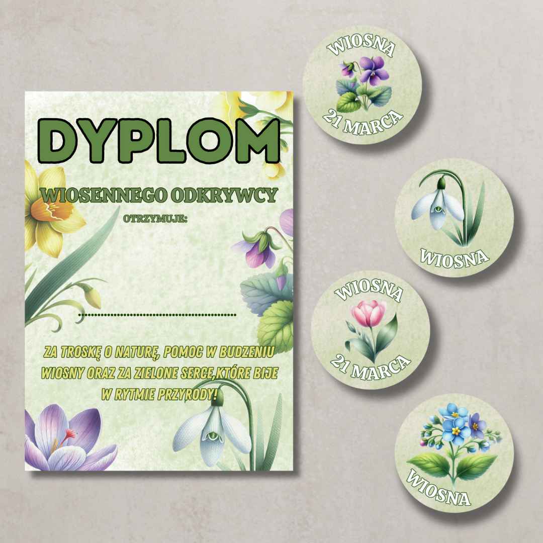 • Dyplom „Wiosennego Odkrywcy” i odznaki – nagrody dla dzieci