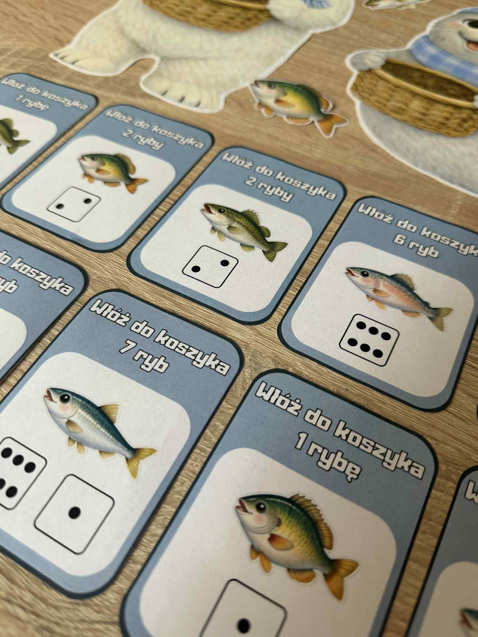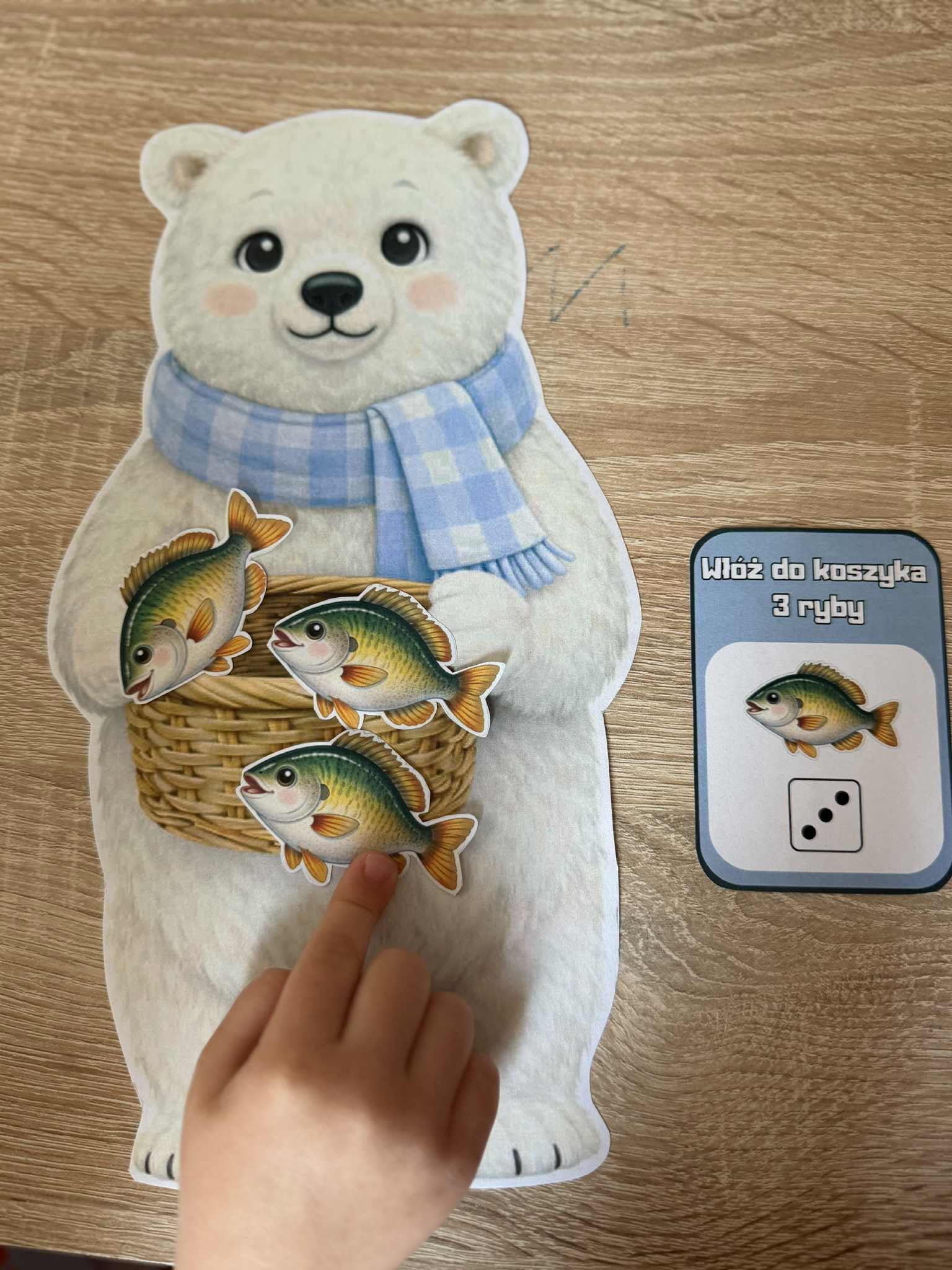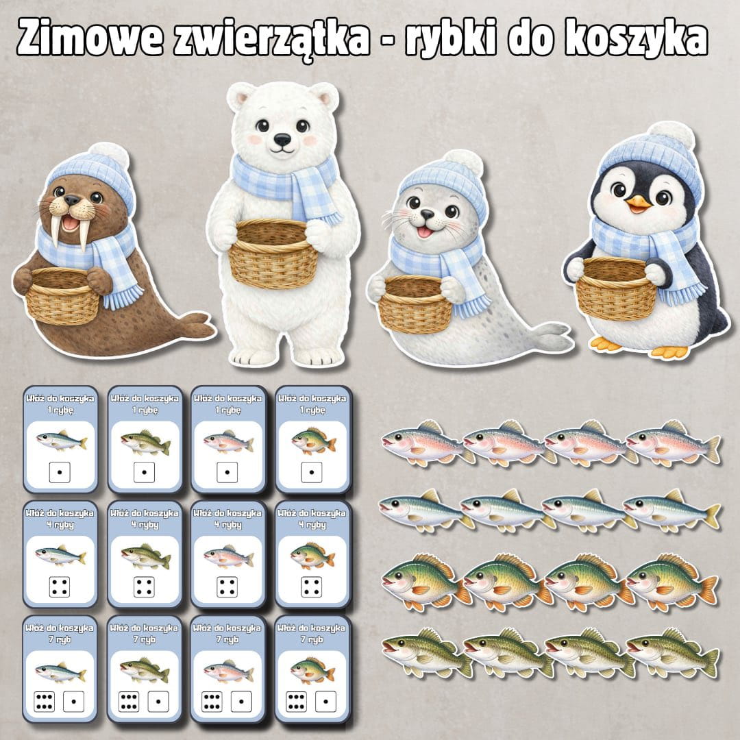 dla przedszkolaków. Dzieci losują karty i wkładają odpowiednią liczbę rybek do koszyka zimowego zwierzątka.