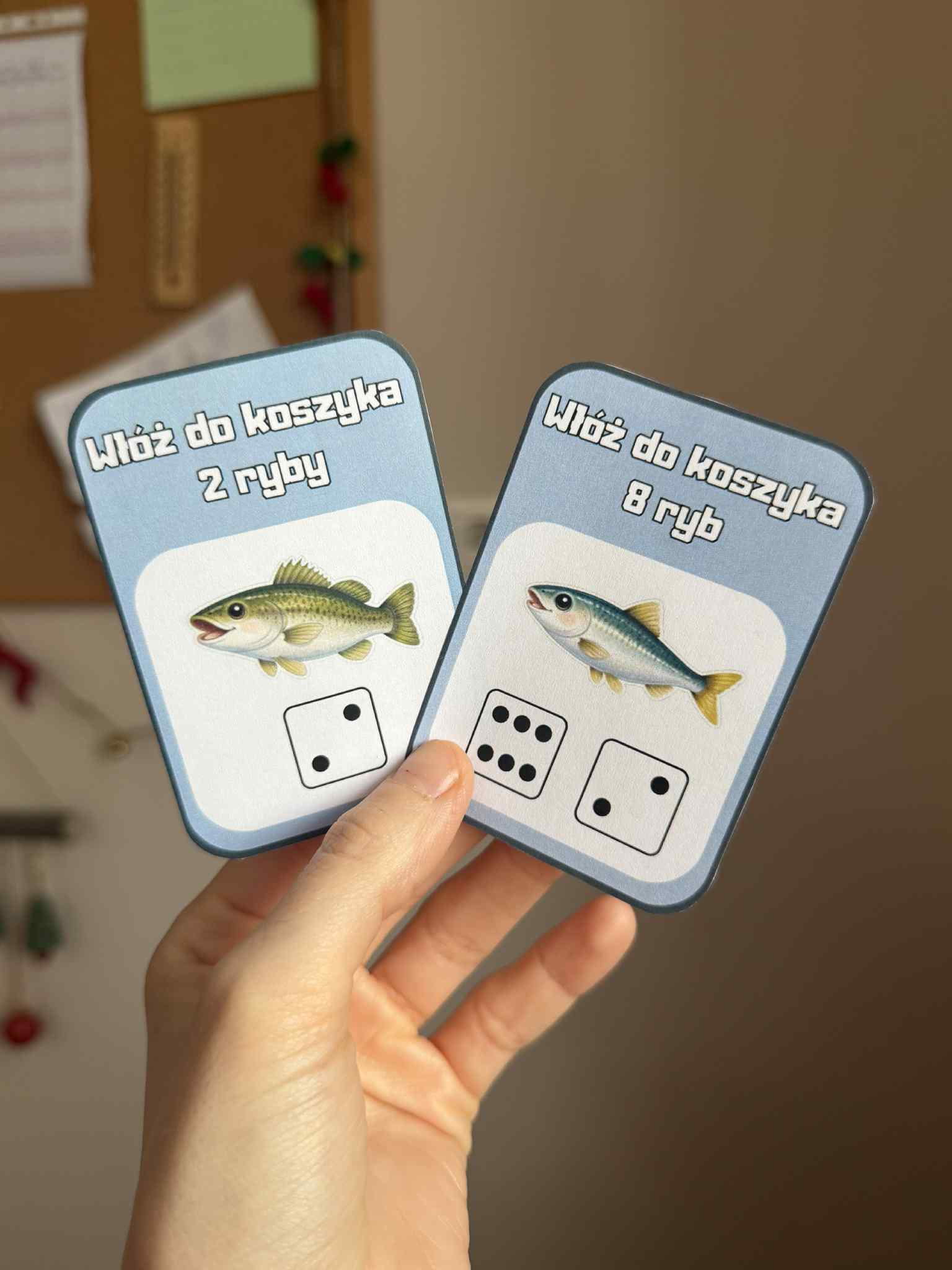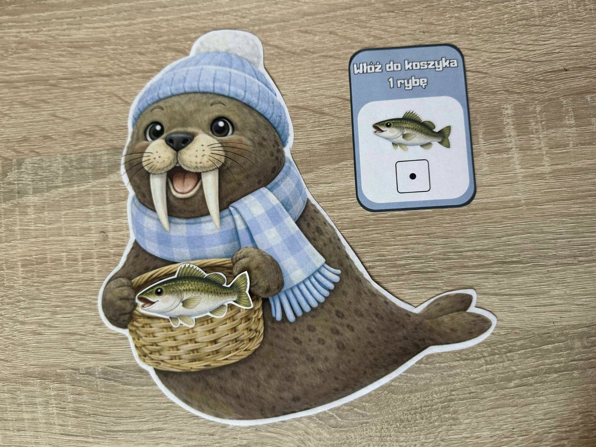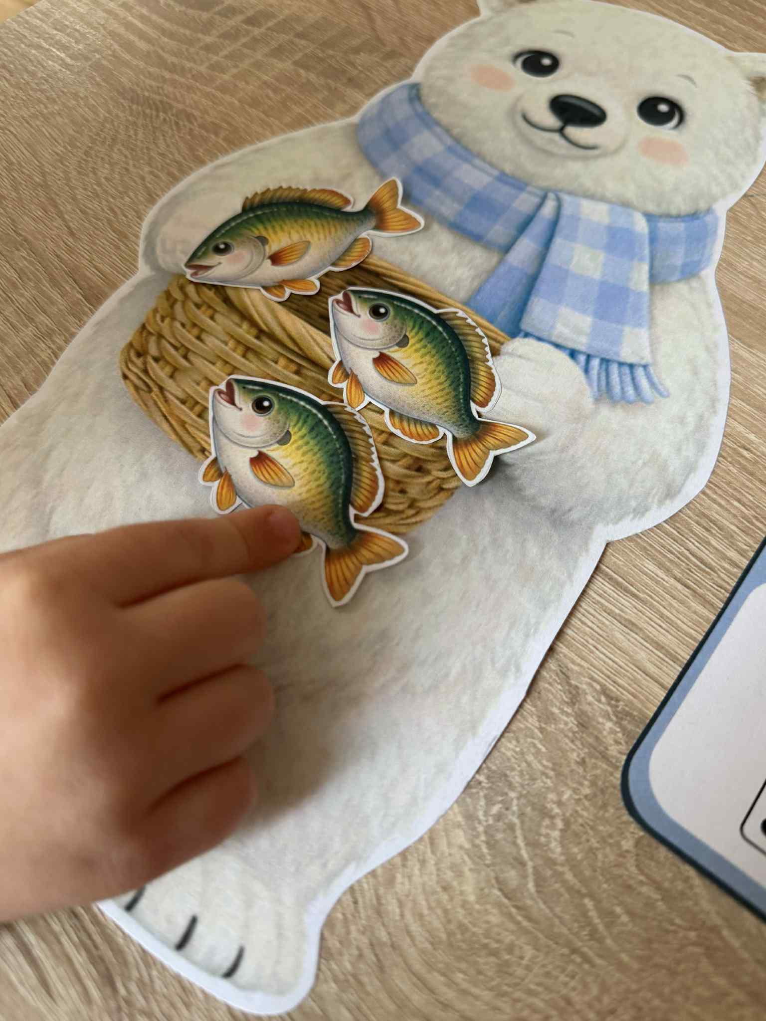 dla przedszkolaków. Dzieci losują karty i wkładają odpowiednią liczbę rybek do koszyka zimowego zwierzątka.