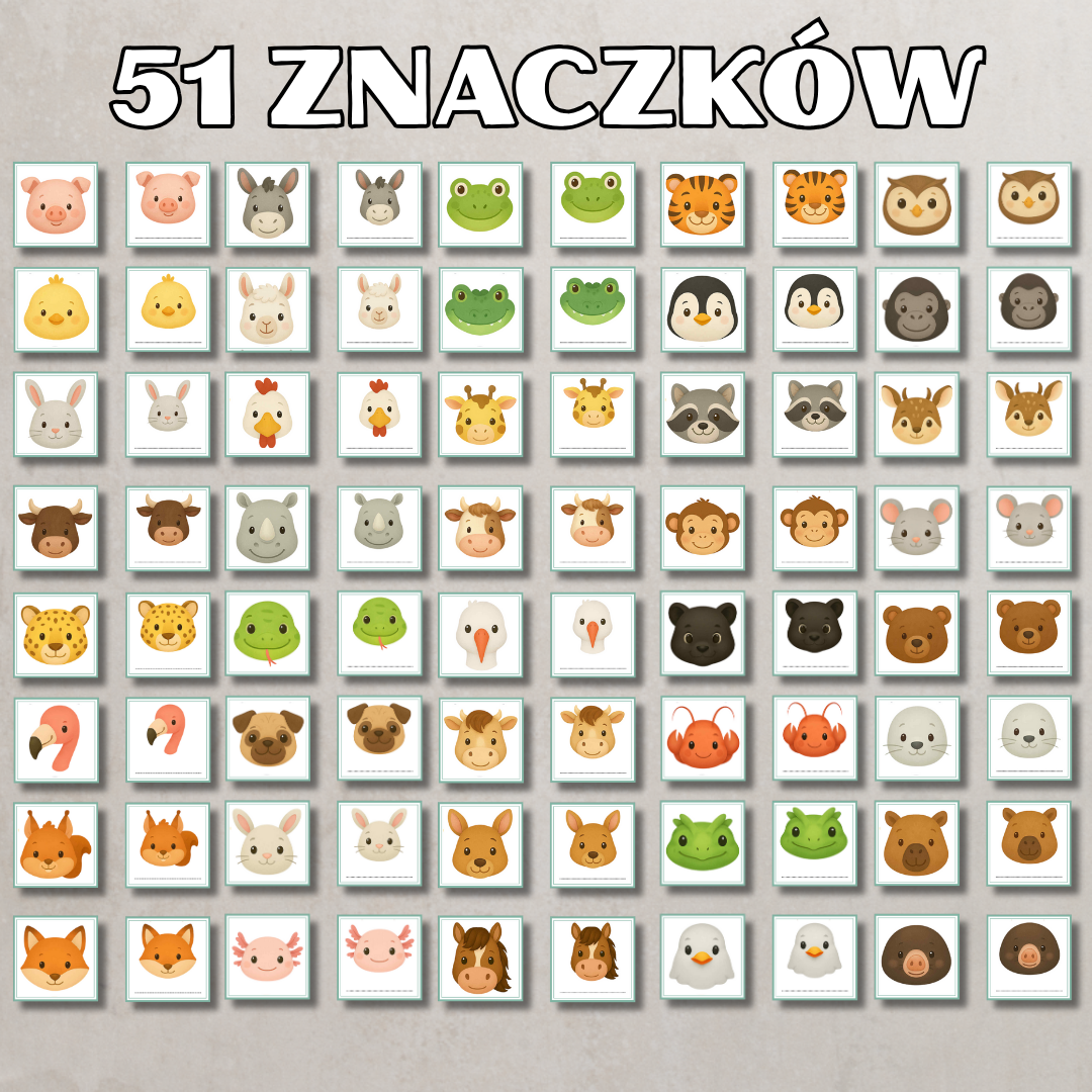 Zestaw 51 kolorowych znaczków z uroczymi zwierzątkami, idealny do oznaczenia szafek, półek lub miejsc w przedszkolu. Każdy znaczek dostępny jest w dwóch wersjach, z miejscem na wpisanie imienia lub z samym obrazkiem. Znaczki pomagają dzieciom szybko odnaleźć swoje miejsce, uczą samodzielności i dbania o porządek, a przy tym pięknie ozdabiają salę.