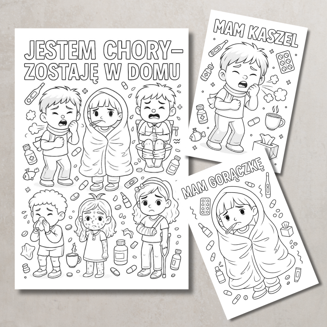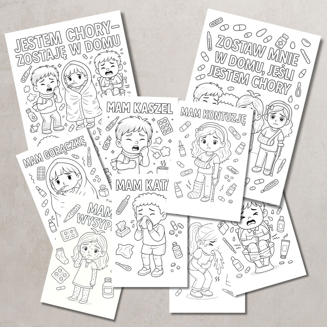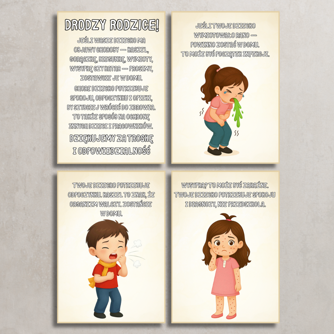 • 7 plakatów edukacyjnych (2 na jednej stronie A4) – przedstawiających różne objawy choroby, takie jak kaszel, gorączka, wysypka czy ból brzucha. Każdy plakat ilustruje dziecko w realistycznej, przyjaznej sytuacji.