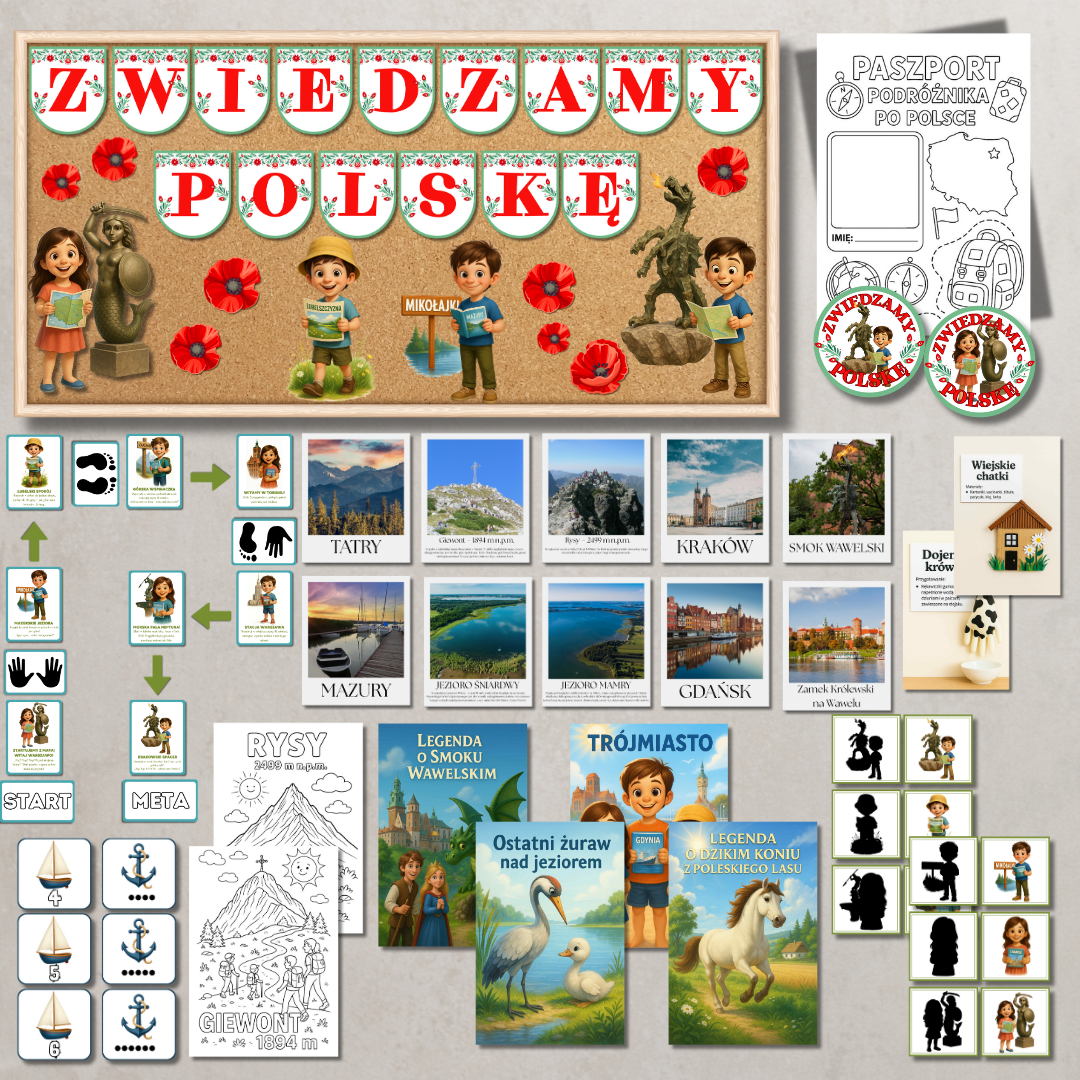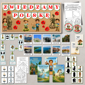 „Zwiedzamy Polskę” to bogaty pakiet edukacyjny stworzony z myślą o przedszkolach i szkołach, które chcą w ciekawy sposób przybliżyć dzieciom piękno naszego kraju. Materiały pozwalają poznać najważniejsze regiony Polski, ich przyrodę, zabytki, legendy oraz charakterystyczne miejsca, poprzez zabawę, ruch, sztukę i opowieści.
